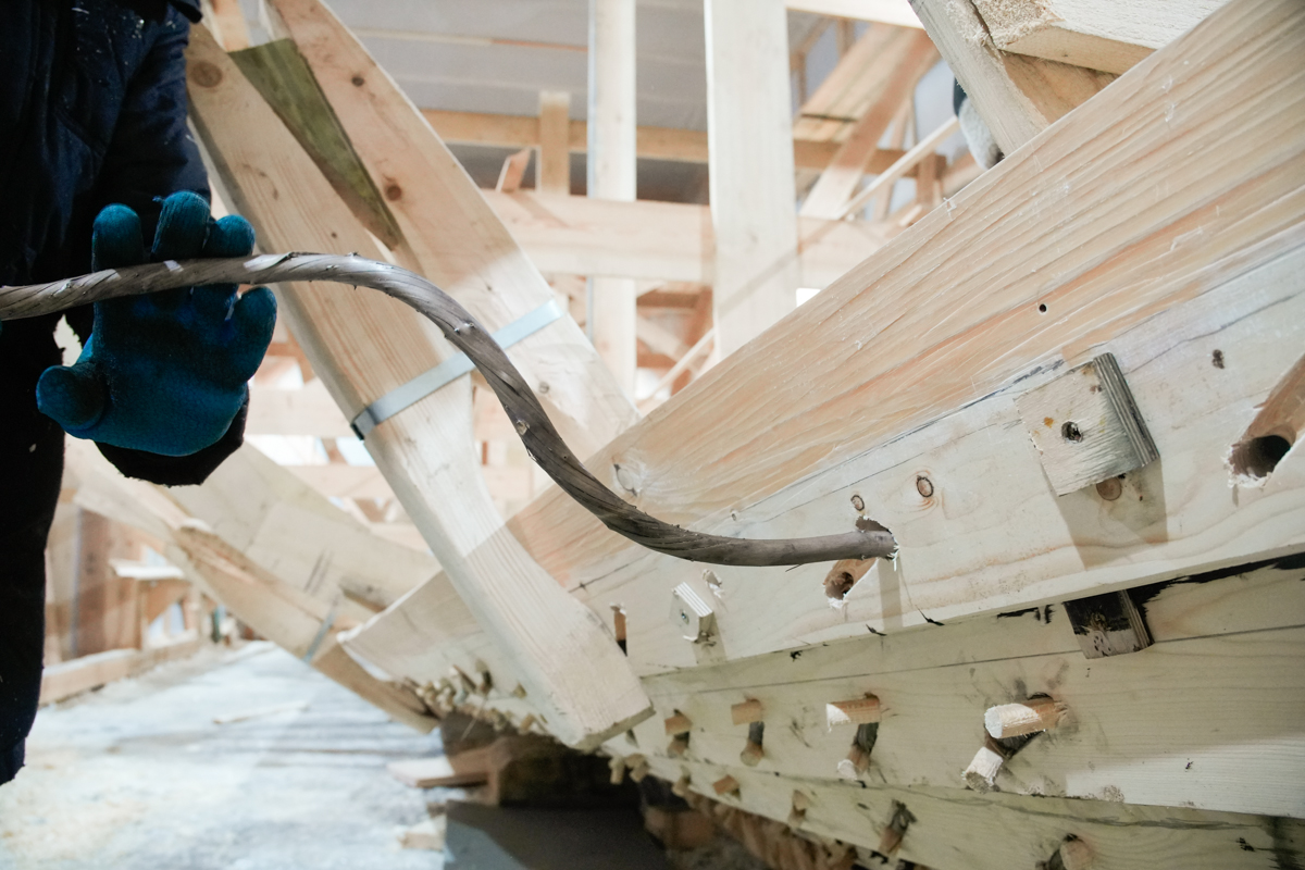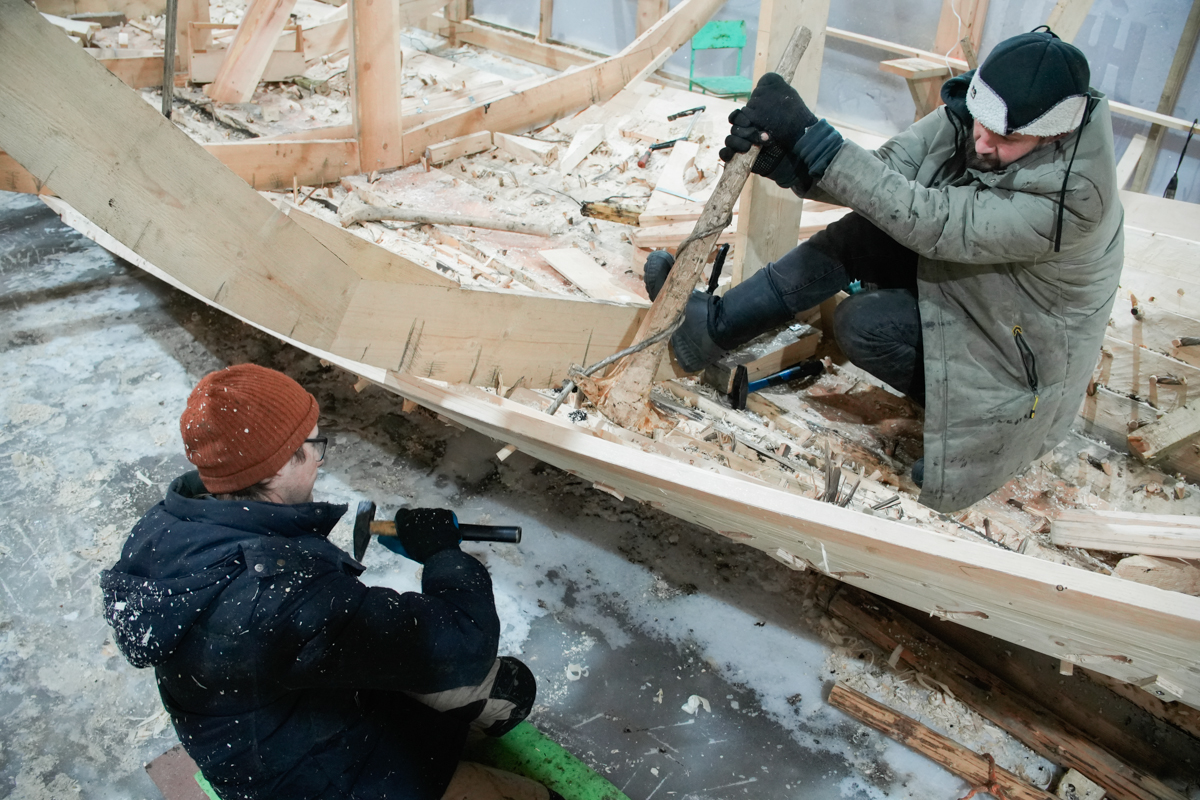 В корме и носу его уже прошивают вицей Ваня с Антоном.