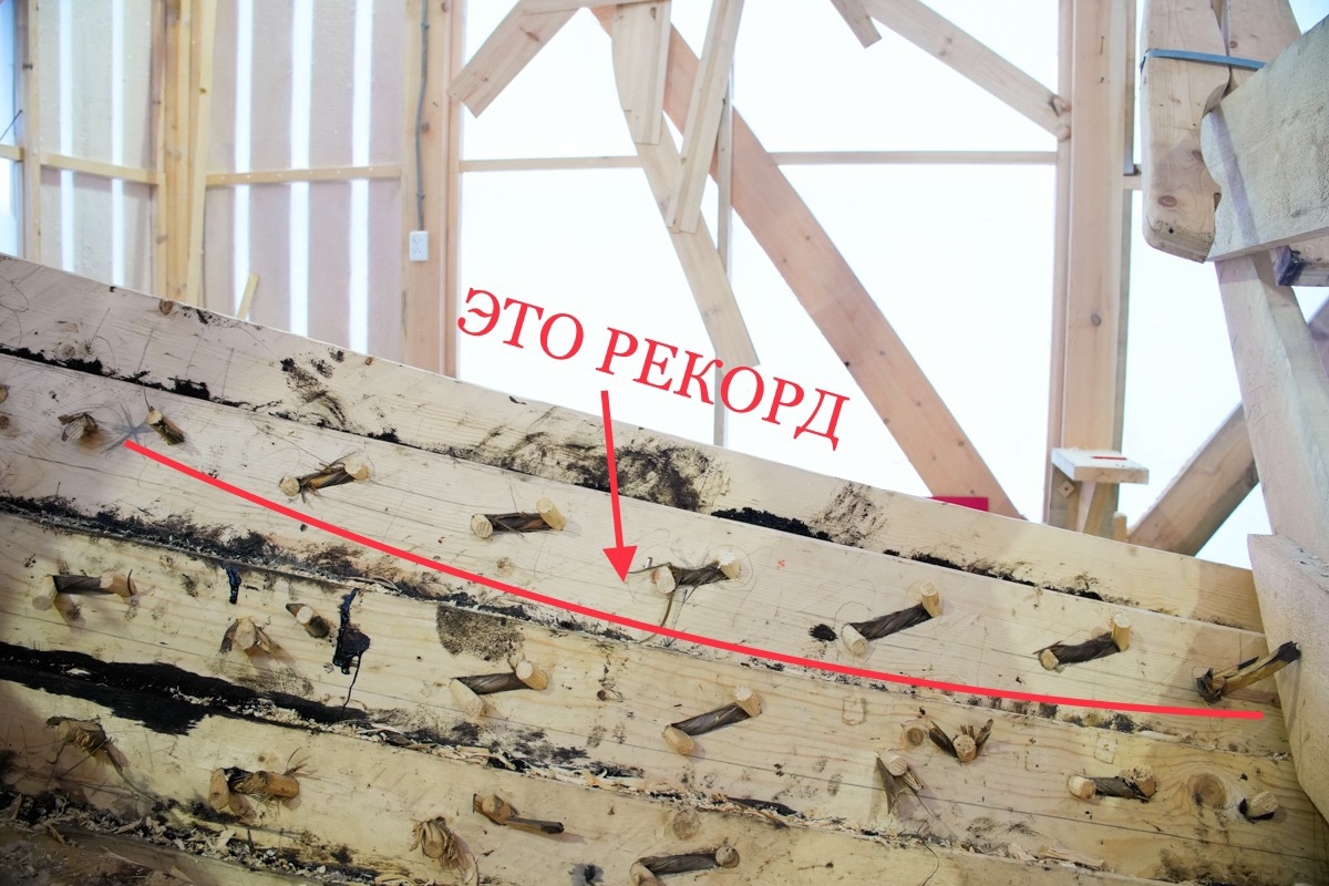 Поставили на мох и смолу правую носовую доску пятого набоя, а на вытяжку — правую кормовую доску шестого набоя.