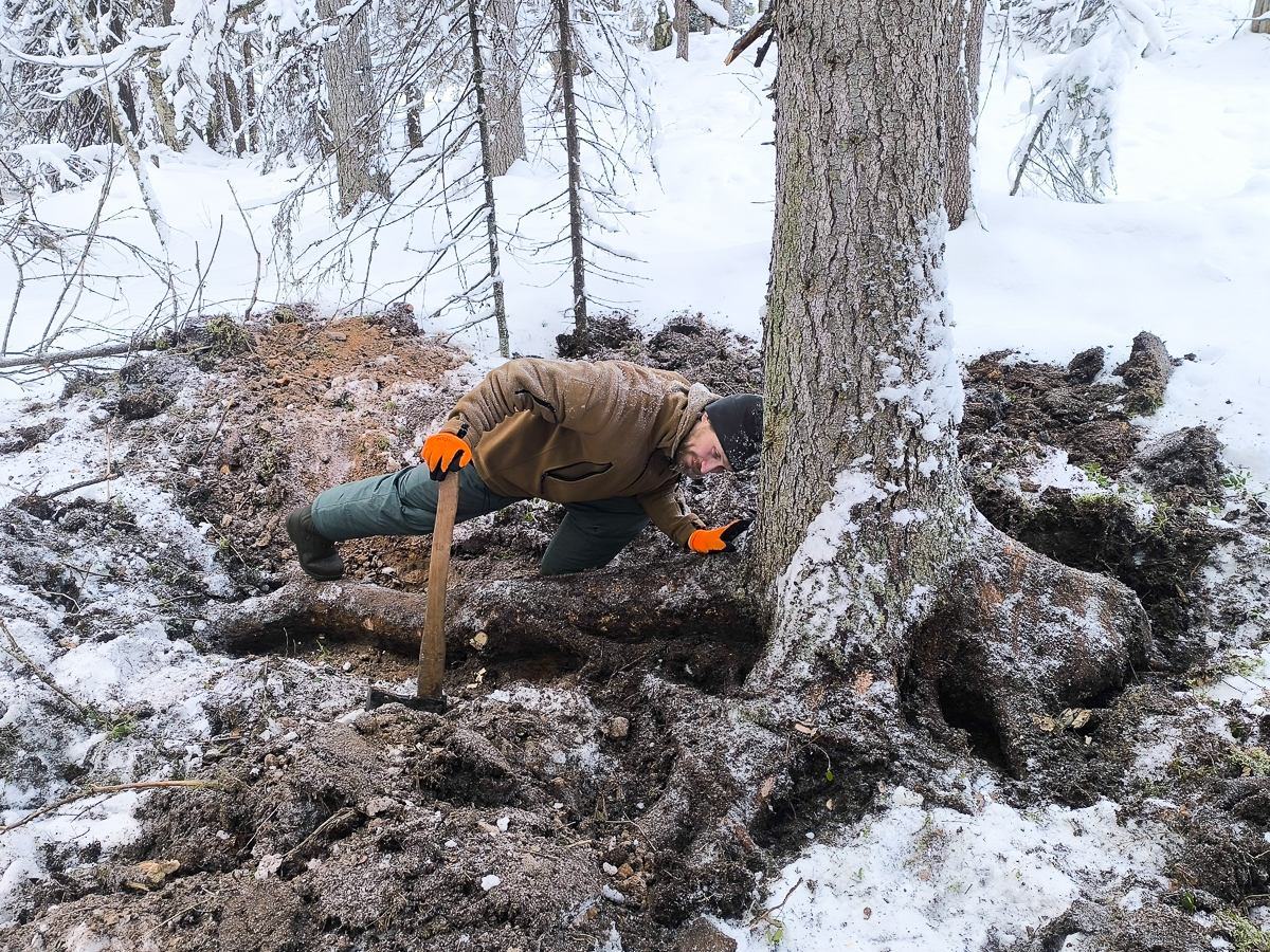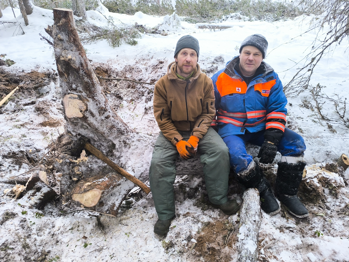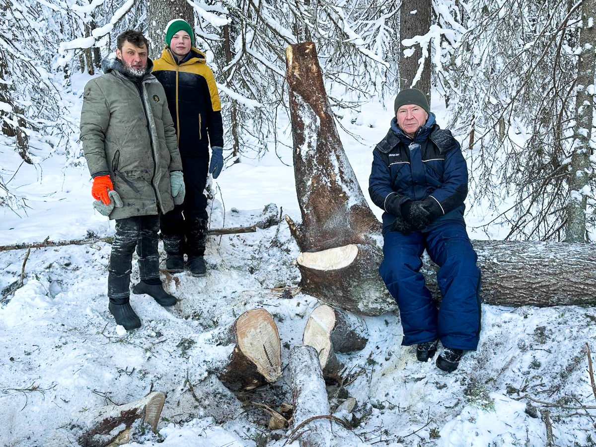 Женя с Василием и Владимиром на делянке в Ижме добывают кокоры.