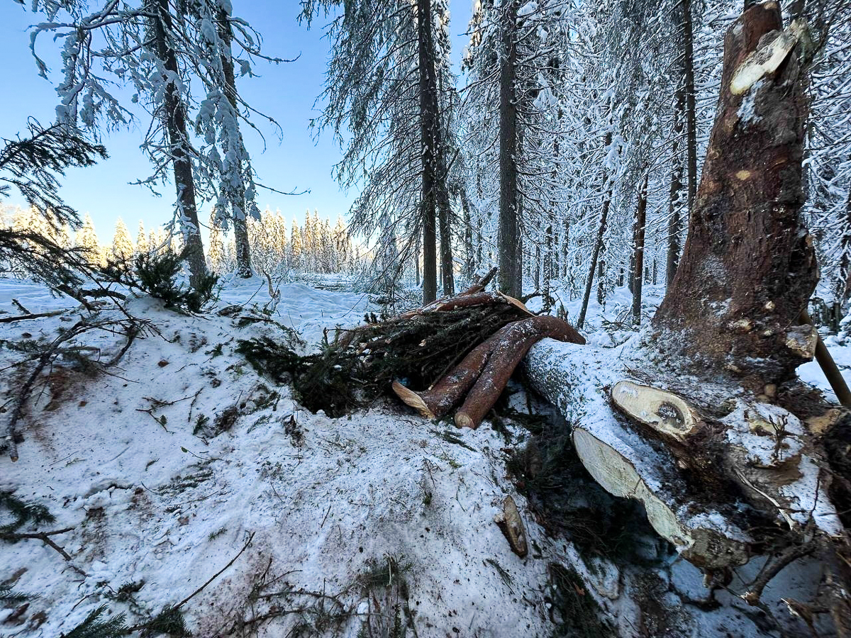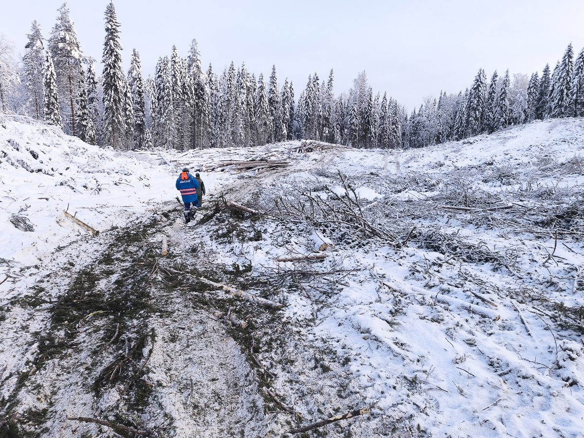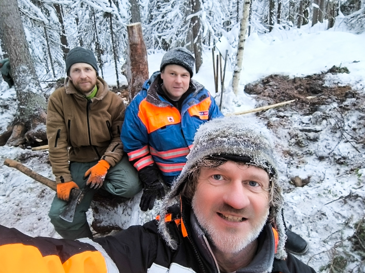 -32 градуса — это не повод отменять кокорный субботник. На делянке в Ижме Алексей Богунов, Алексей Бейм, Антон Спивак и Евгений Шкаруба.