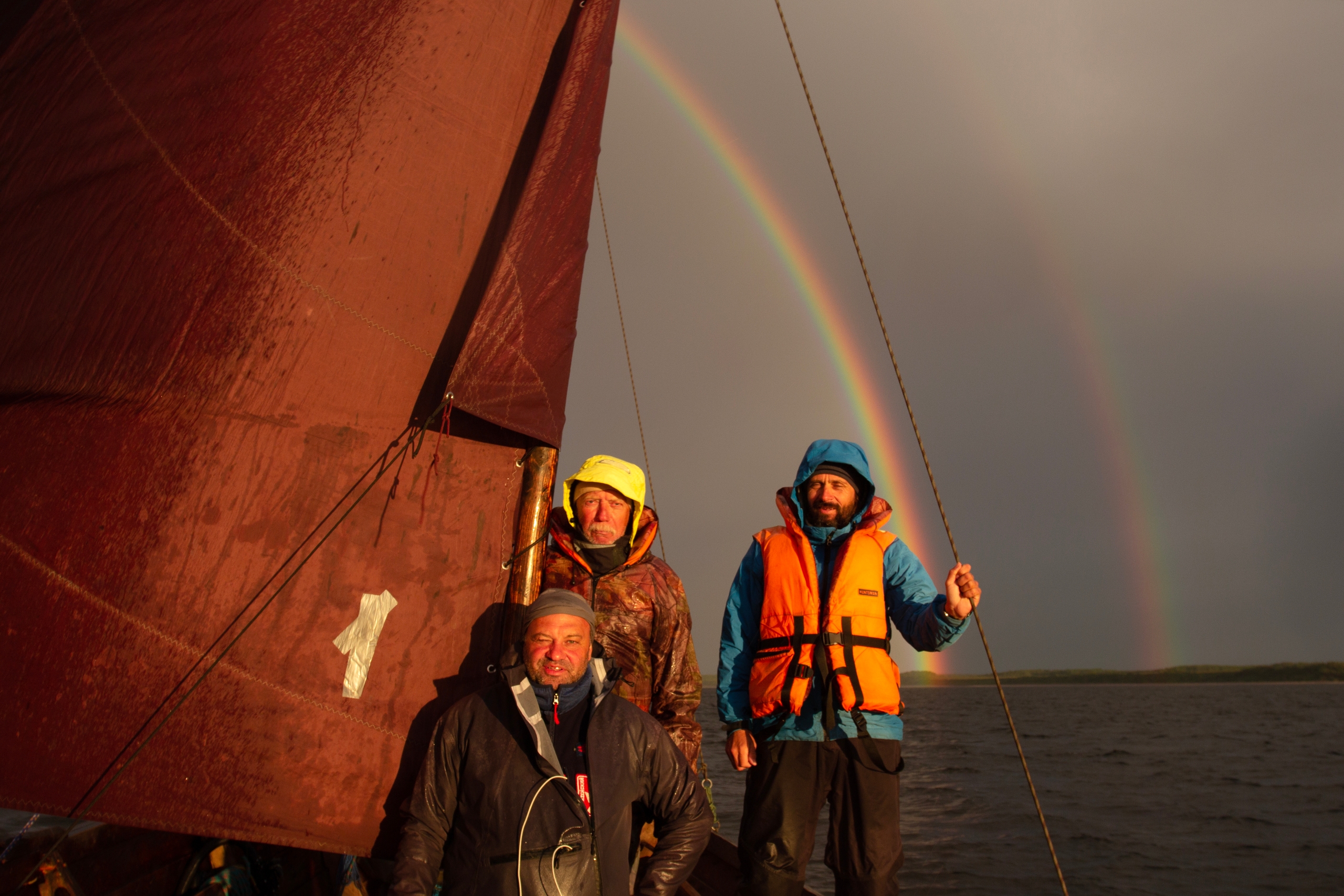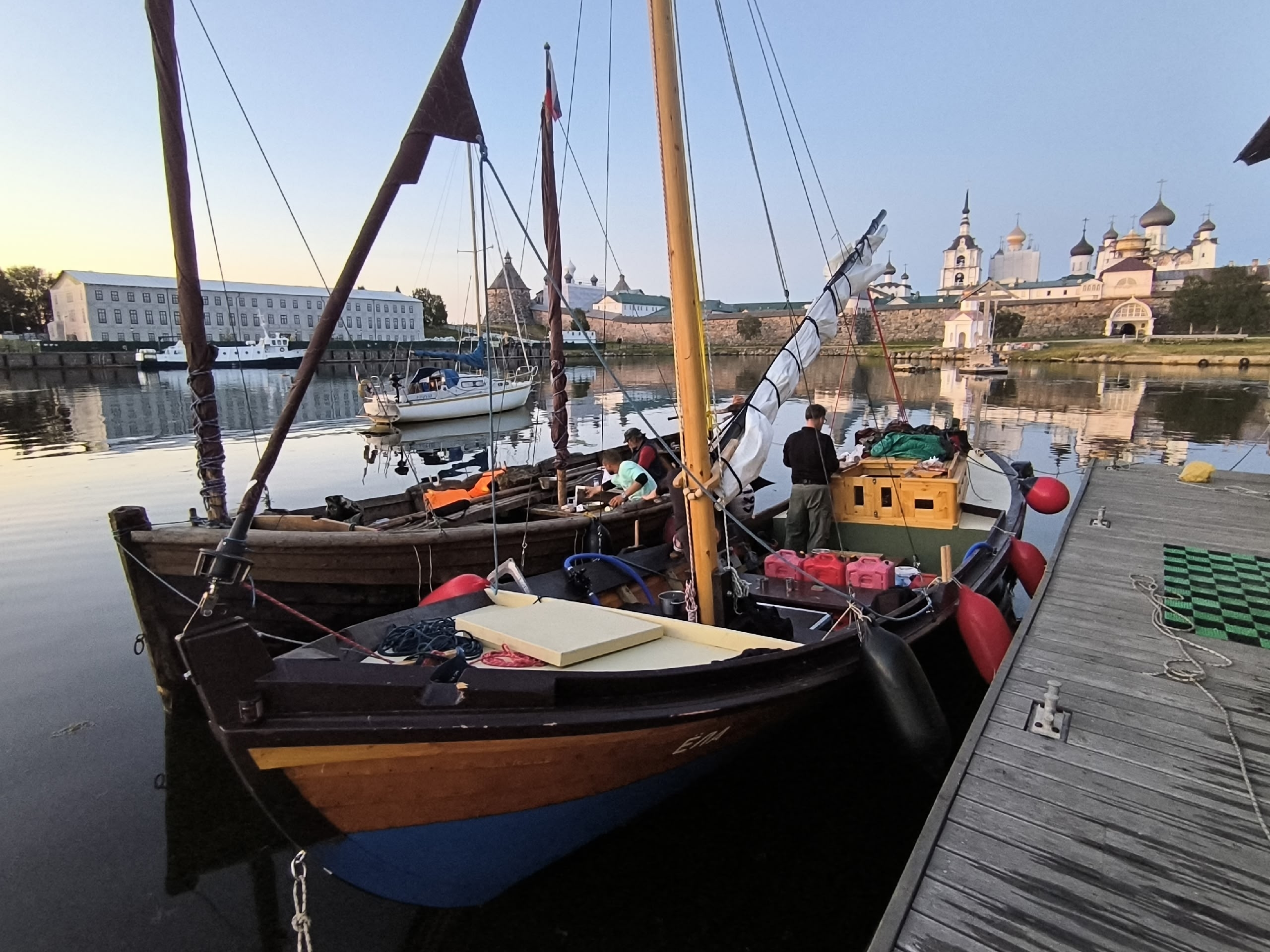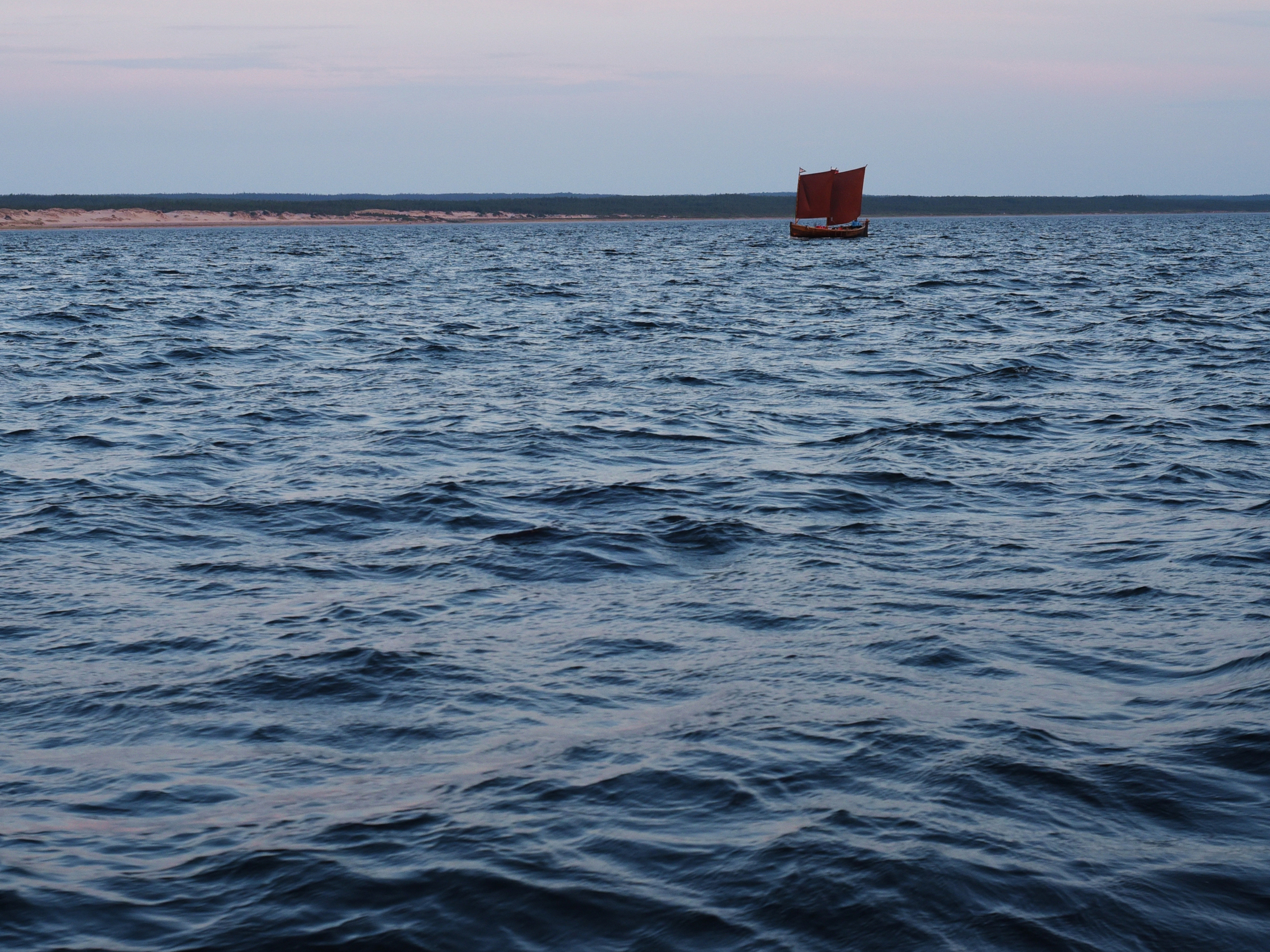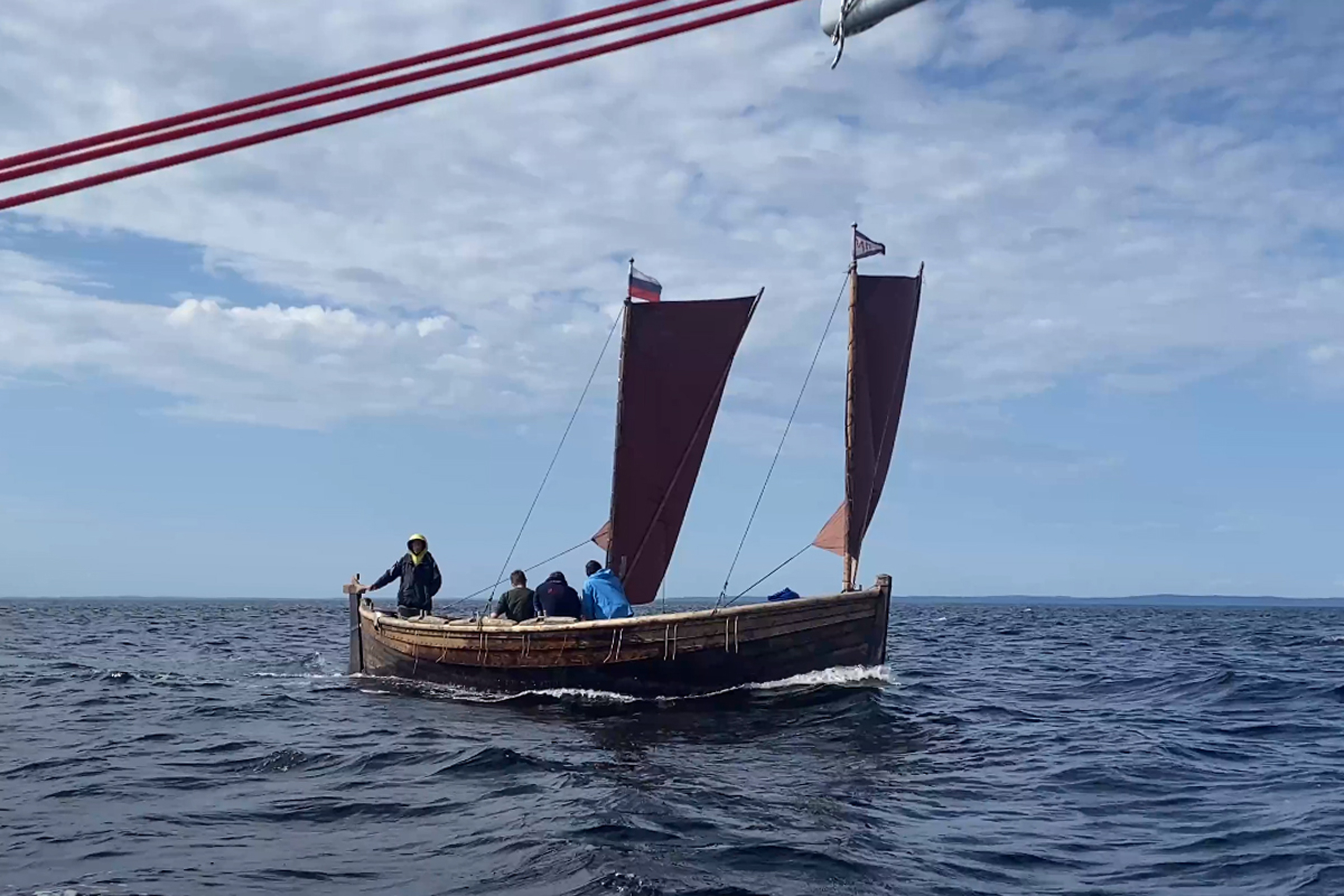 1900, взяли карбас на парусный буксир на траверзе Летнего Наволока. Не включая мотор, идём под парусами вместе.
