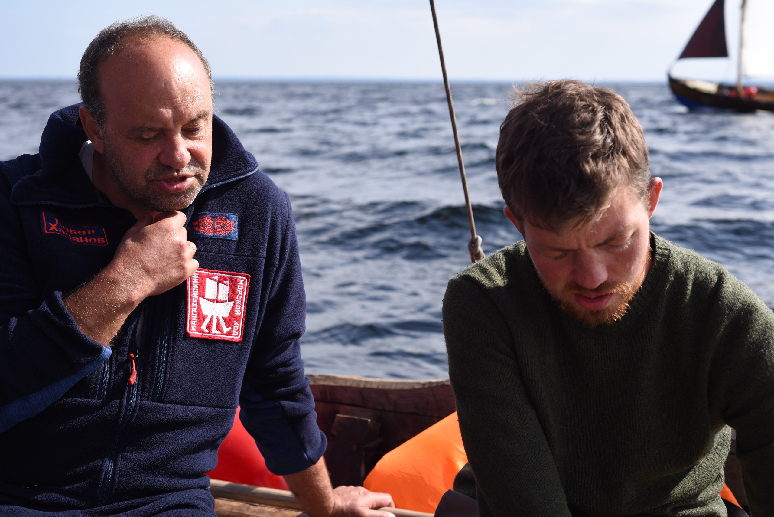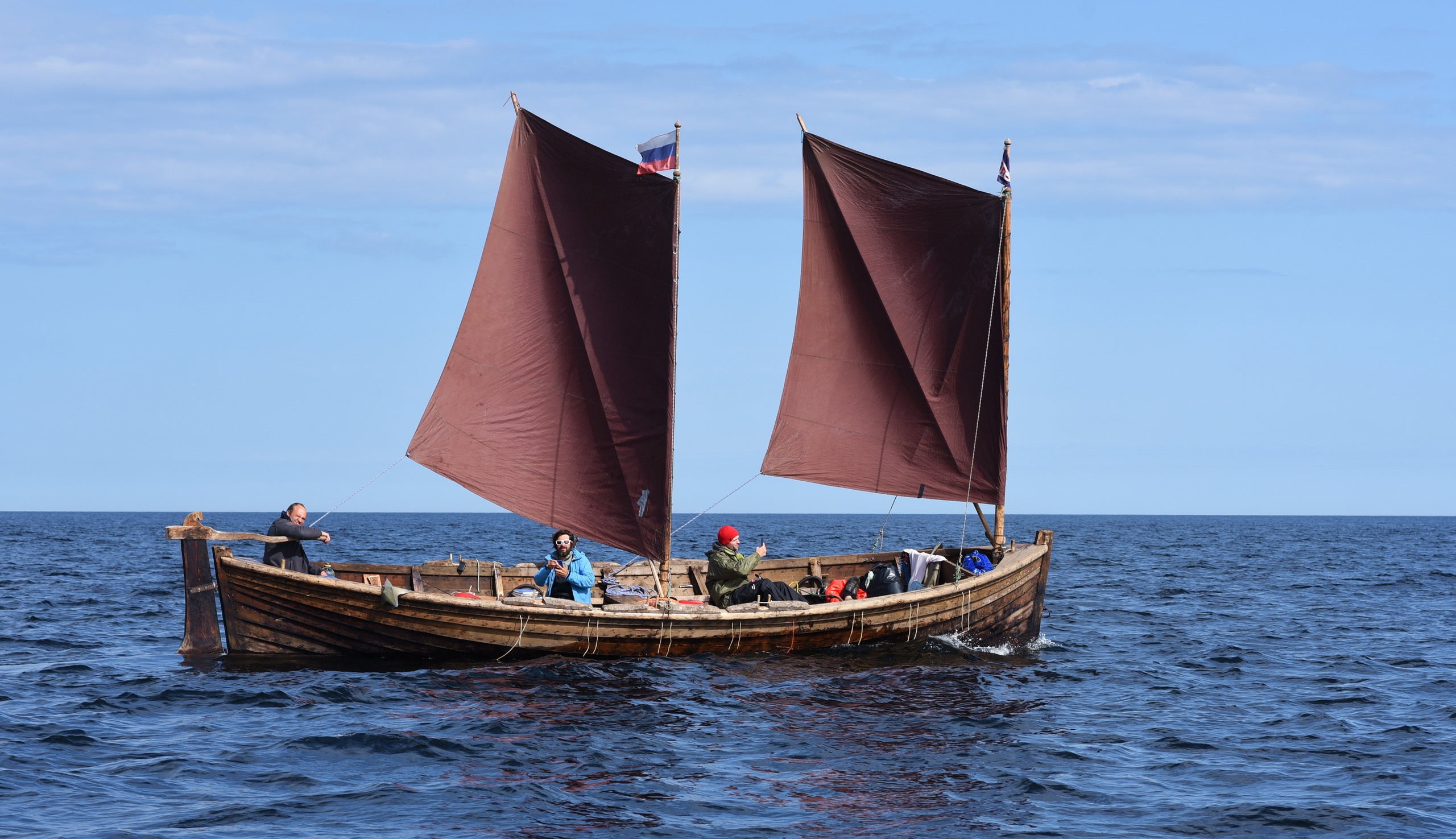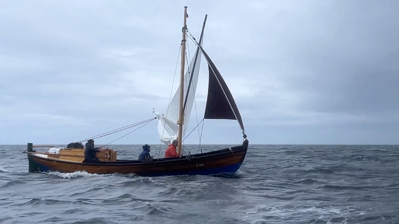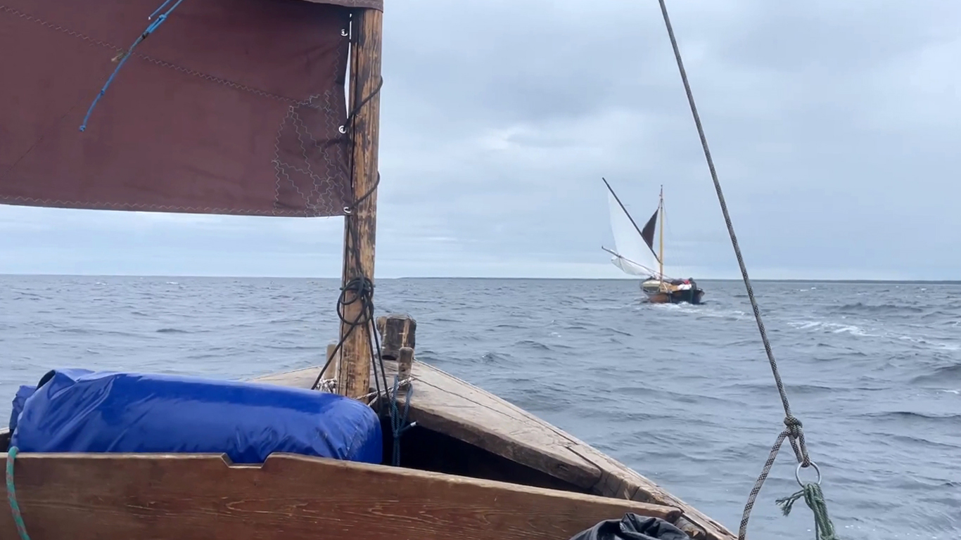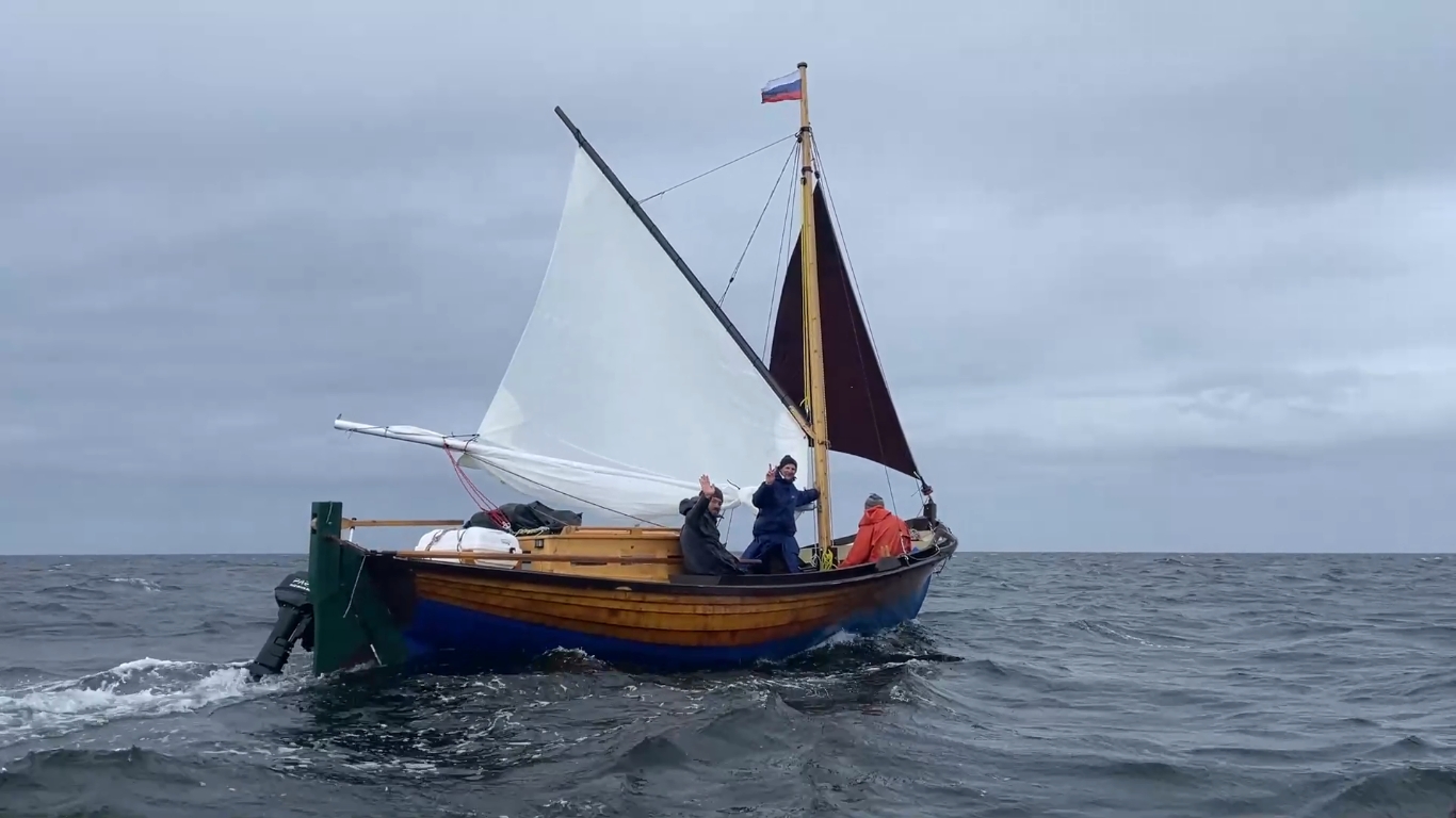 1445, после трепетного обеда и прощания с друзьями у причала музея Товарищества северного мореходства вышли в море. Светит солнце. Дует слабый ветерок.