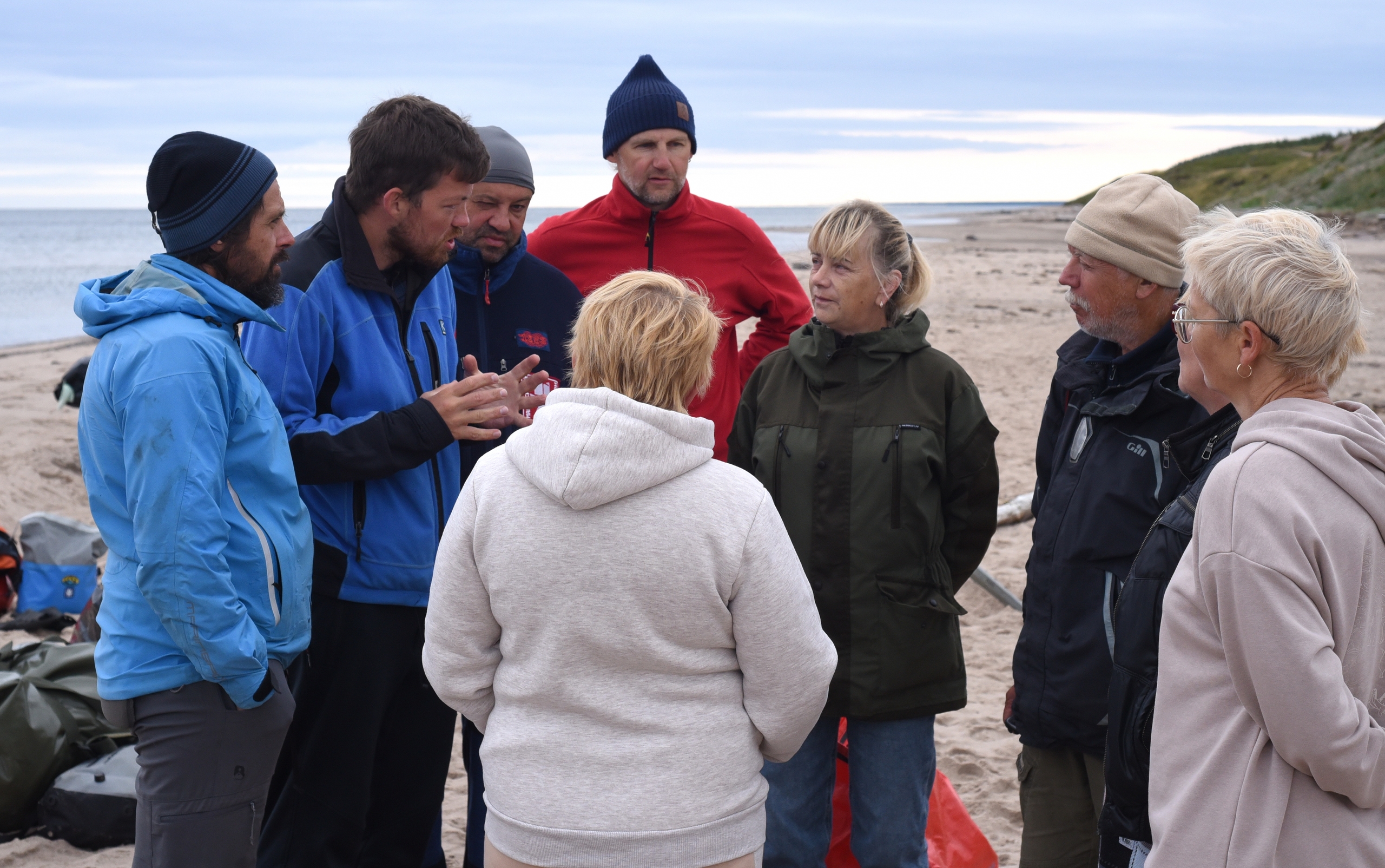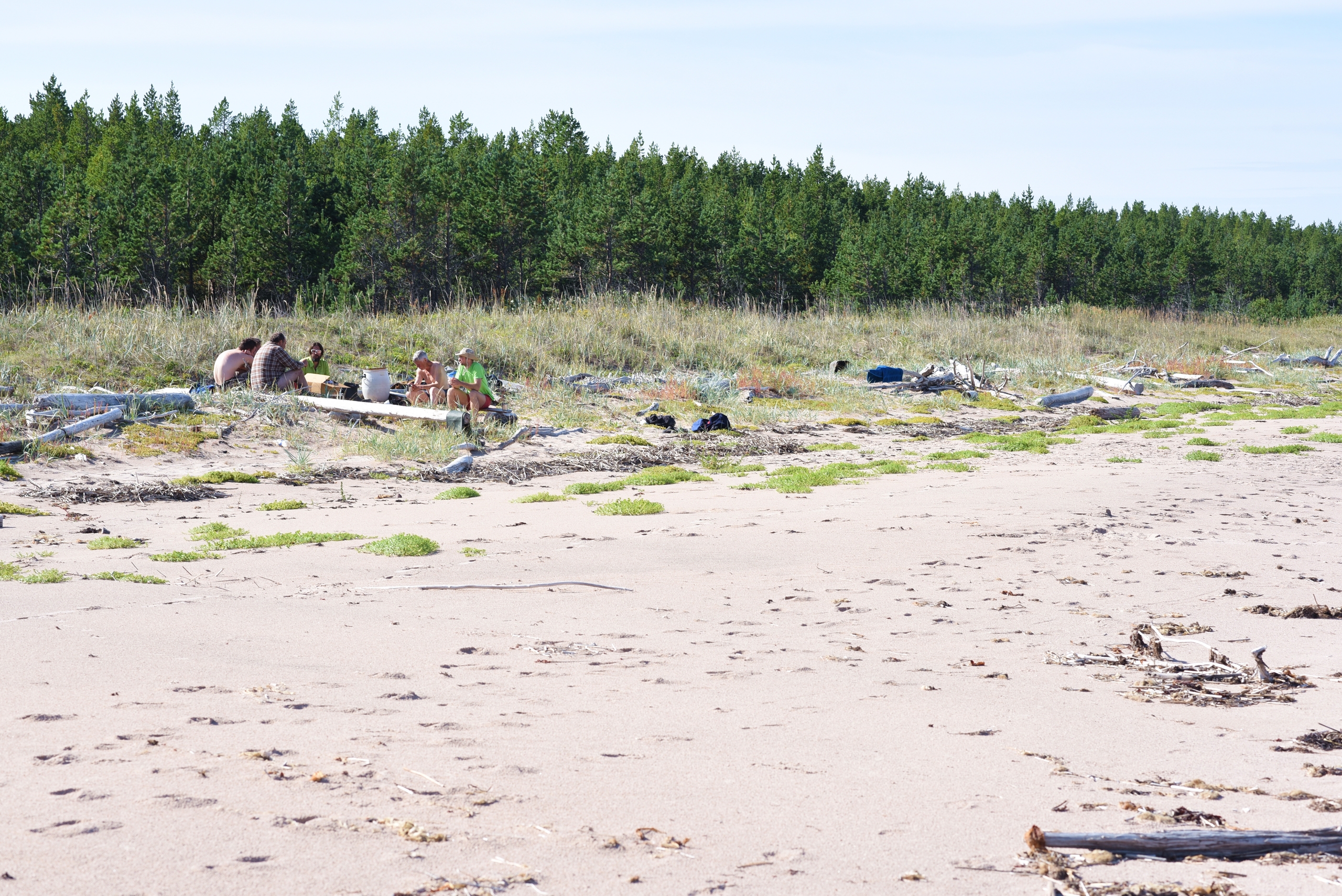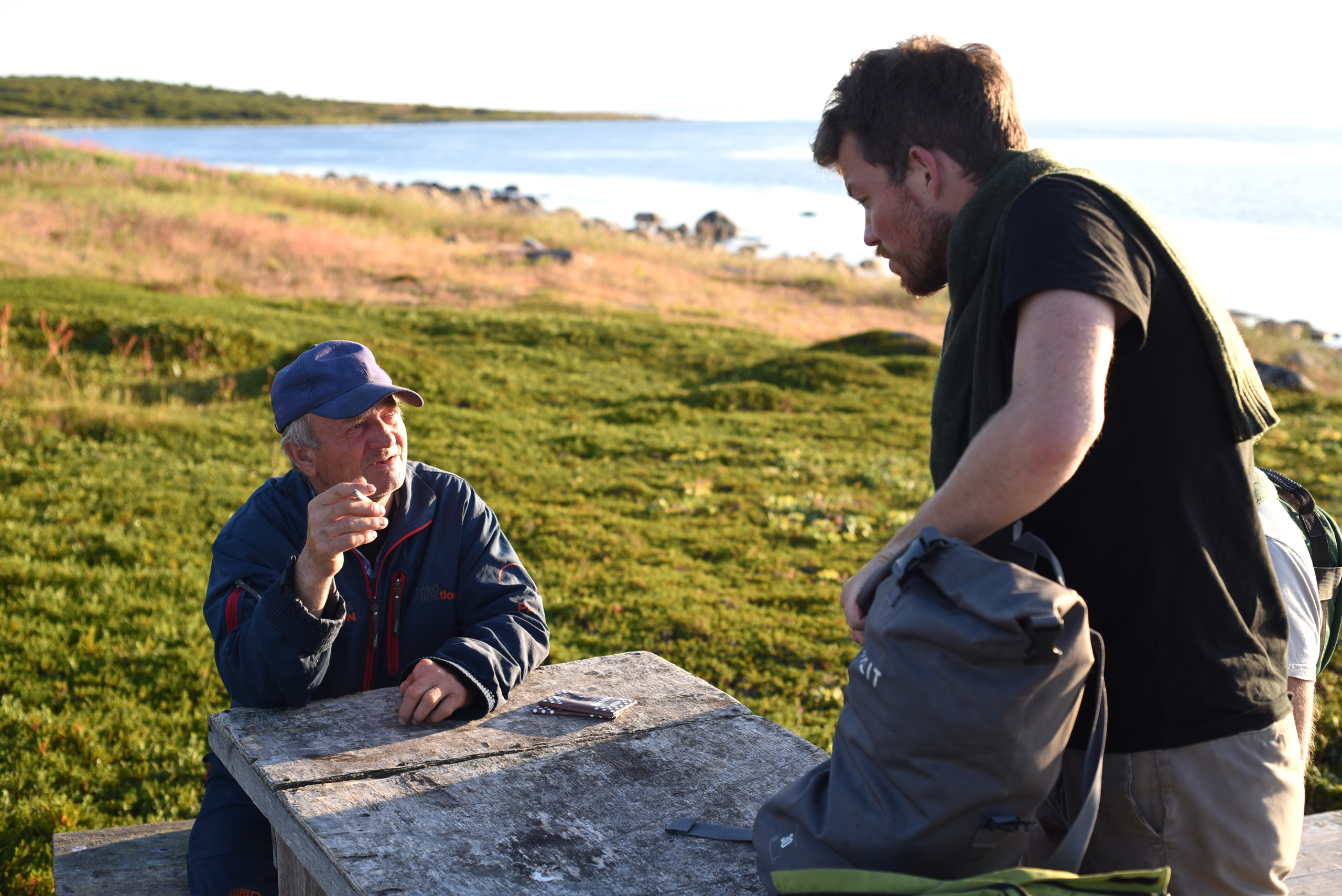 Переждав сильный ветер от северо-востока, собираемся на выход из Яреньги. За ночь ветер развернулся на южный и свежий. Снимаем лагерь. Принимали экскурсию жителей Яреньги.