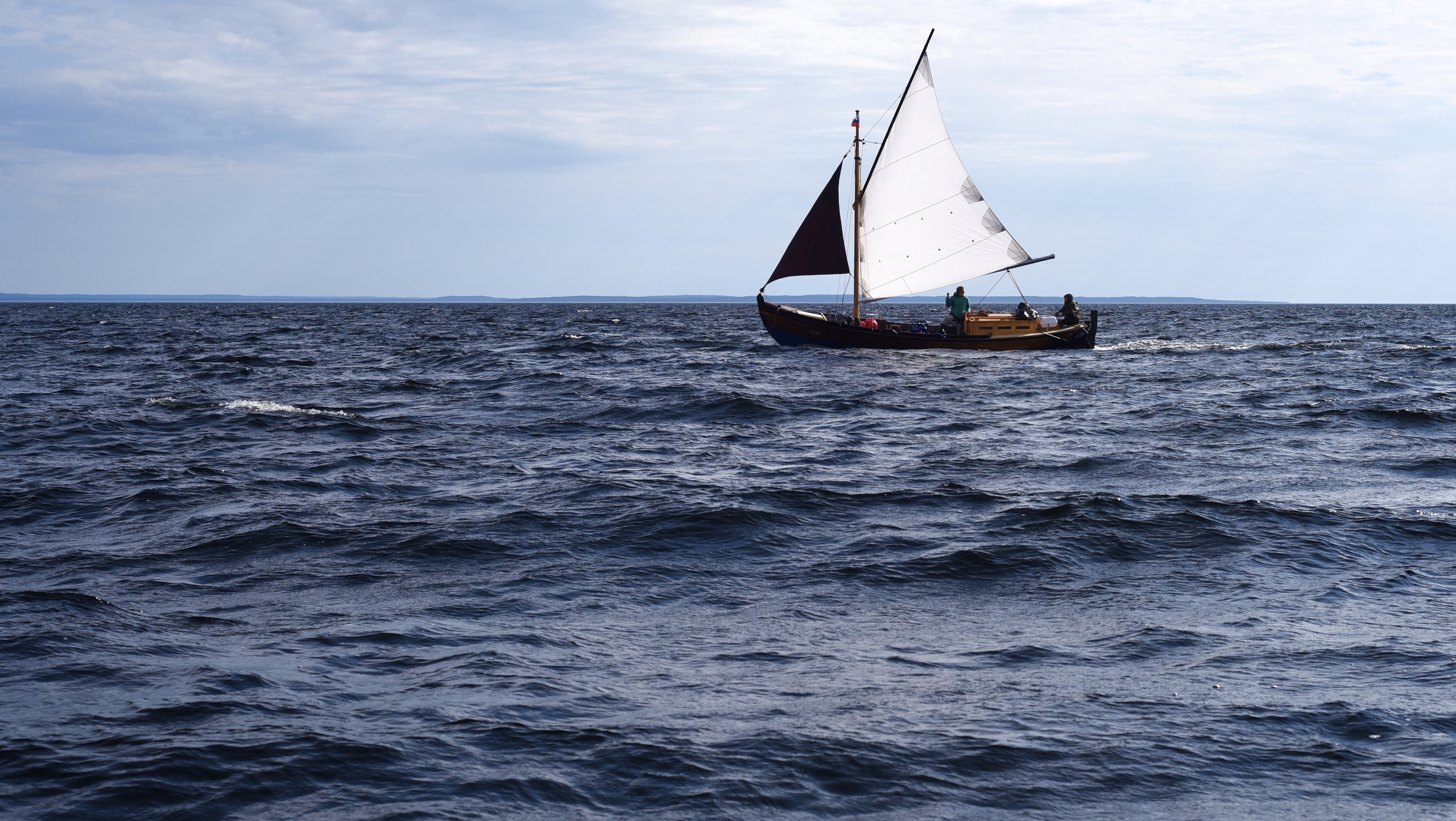 1400, раздувает. Галфвинд правого галса с юго-востока. Бежим до 6 узлов. Карбас не отстаёт — пытается нас обойти.