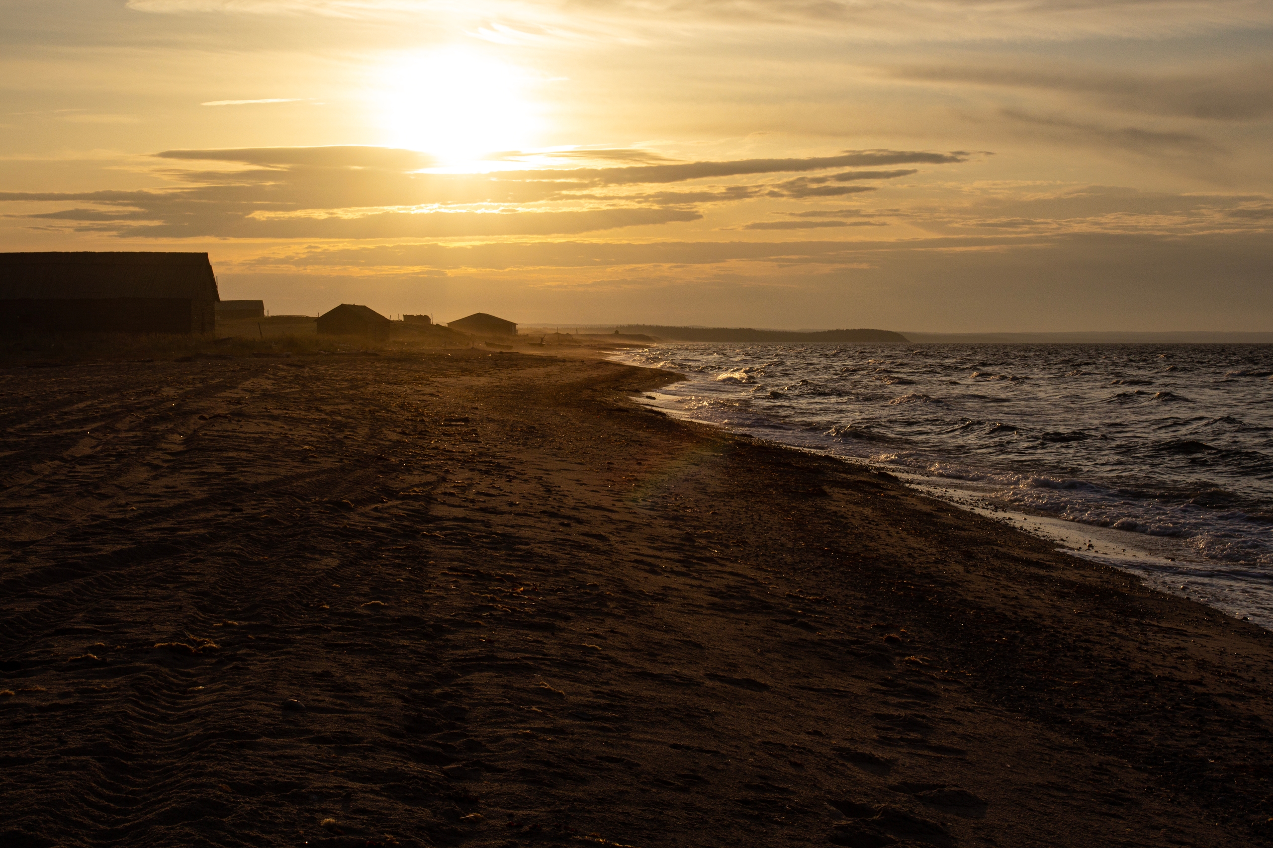 Вечером зашли в Унскую губу в самом начале прилива, поэтому пришлось ждать, пока вода поднимется и позволит подтянуть лодки ближе к берегу Пертоминска. Быстро вечереет.