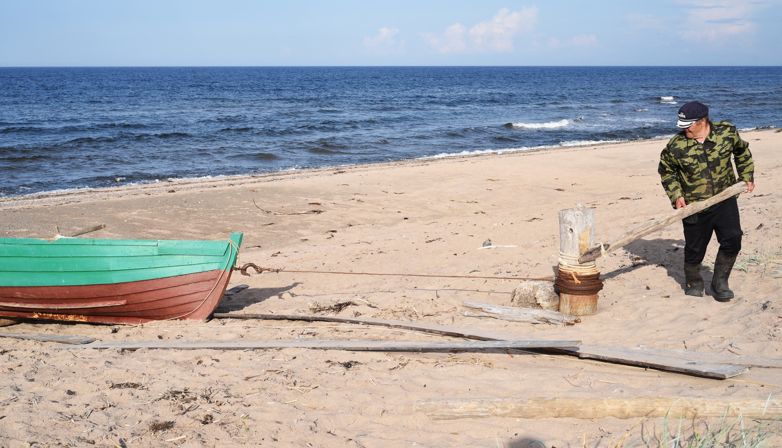 Поэтому, когда вышли к лодкам рано утром, вода прилива ещё не сняла «Матеру» с грунта.