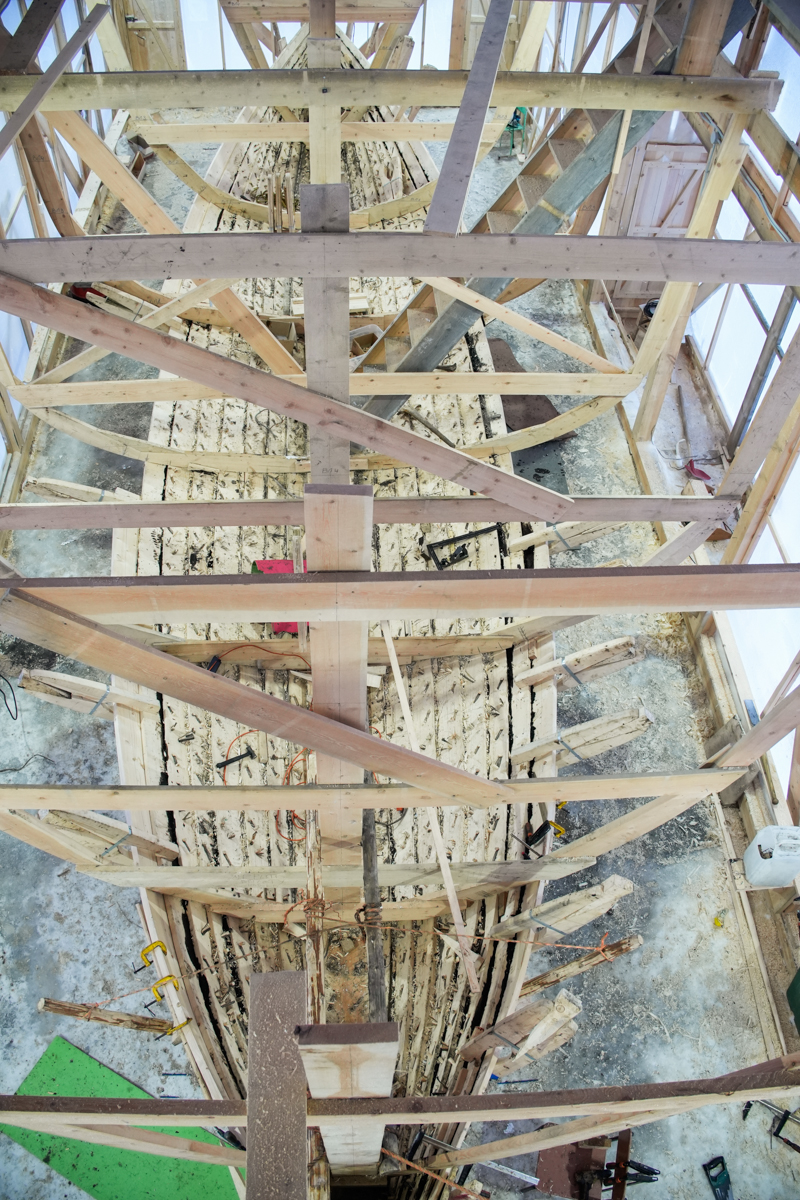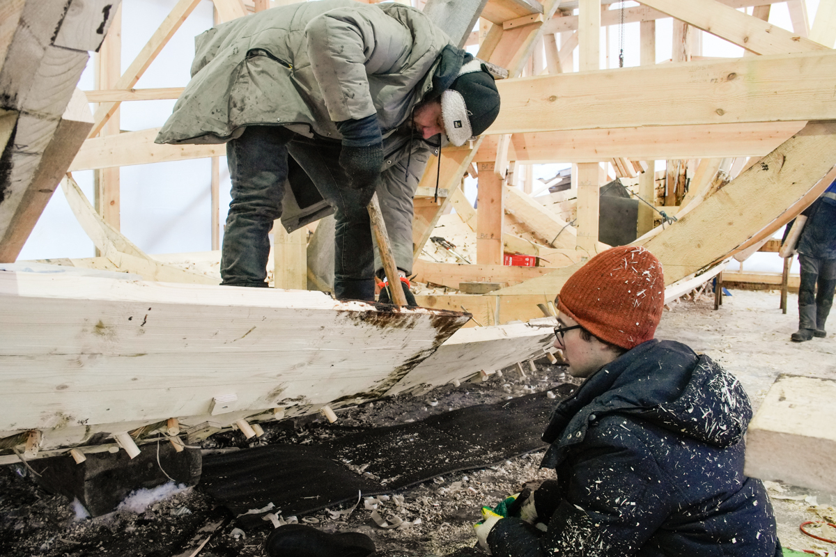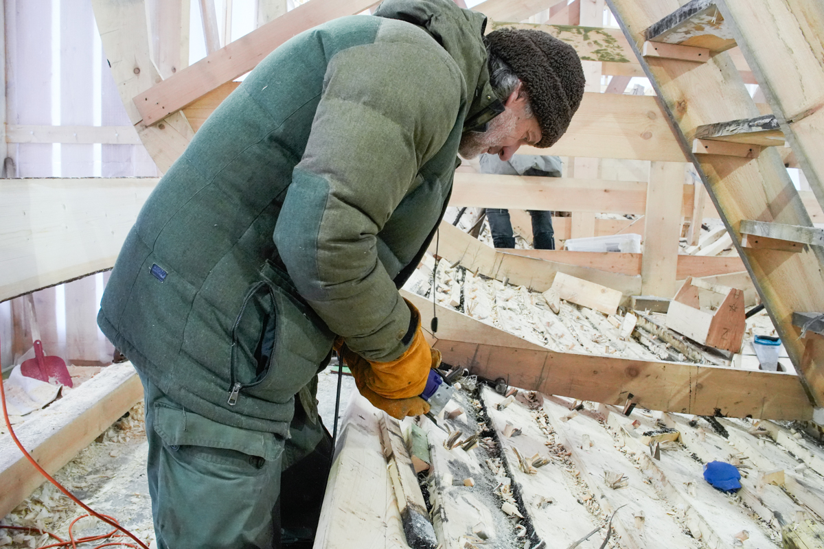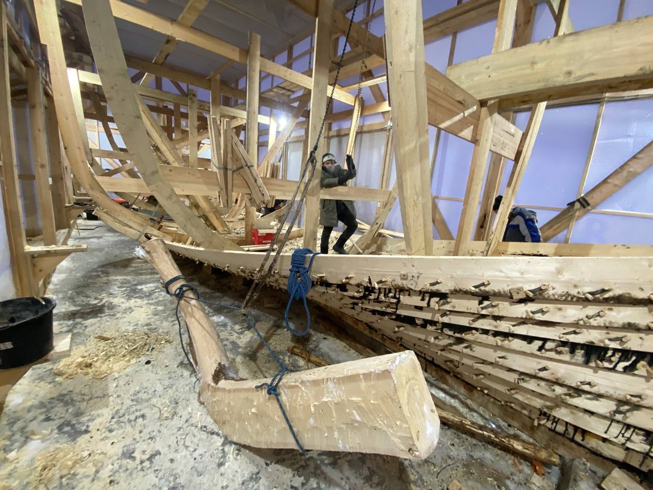 Антон делает под крышей ангара перила (для безопасности) и подвижную деревянную кран-балку — тельфер. С её помощью мы будем поднимать и ставить на коч будущие кокорные шпангоуты.