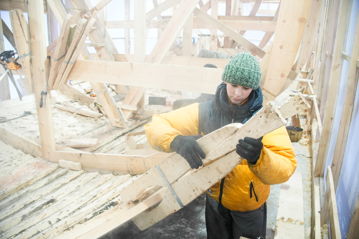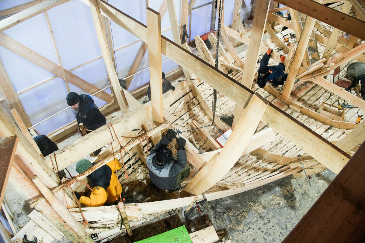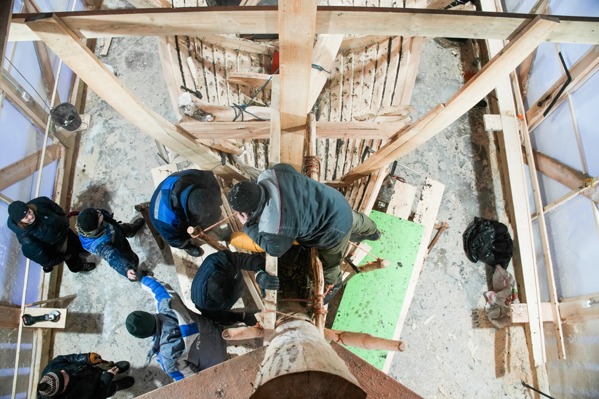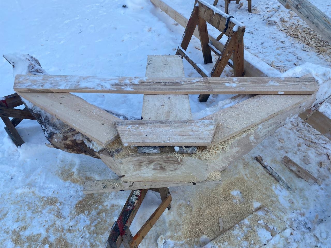 Антон делает под крышей ангара перила (для безопасности) и подвижную деревянную кран-балку — тельфер. С её помощью мы будем поднимать и ставить на коч будущие кокорные шпангоуты.