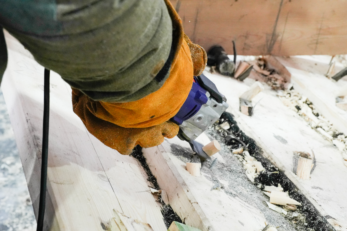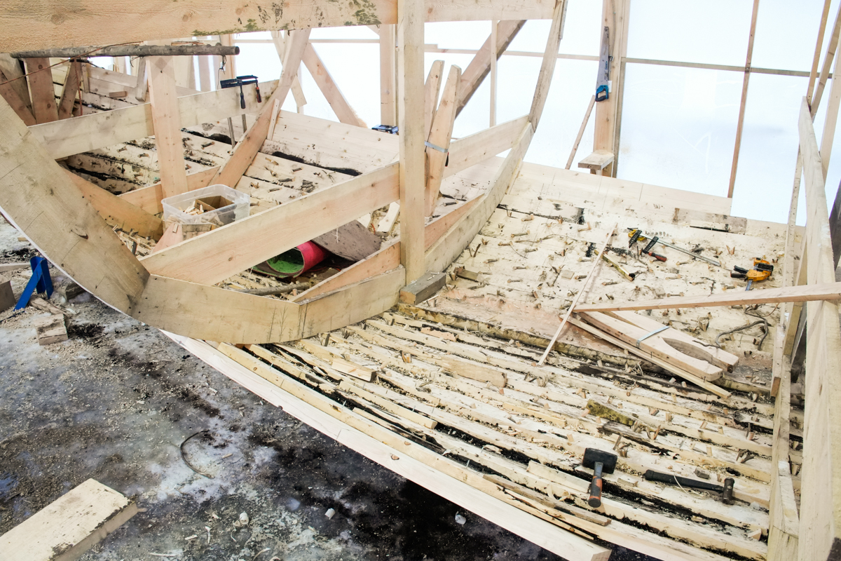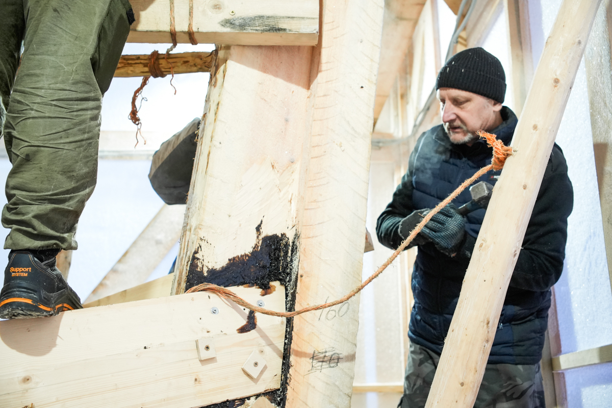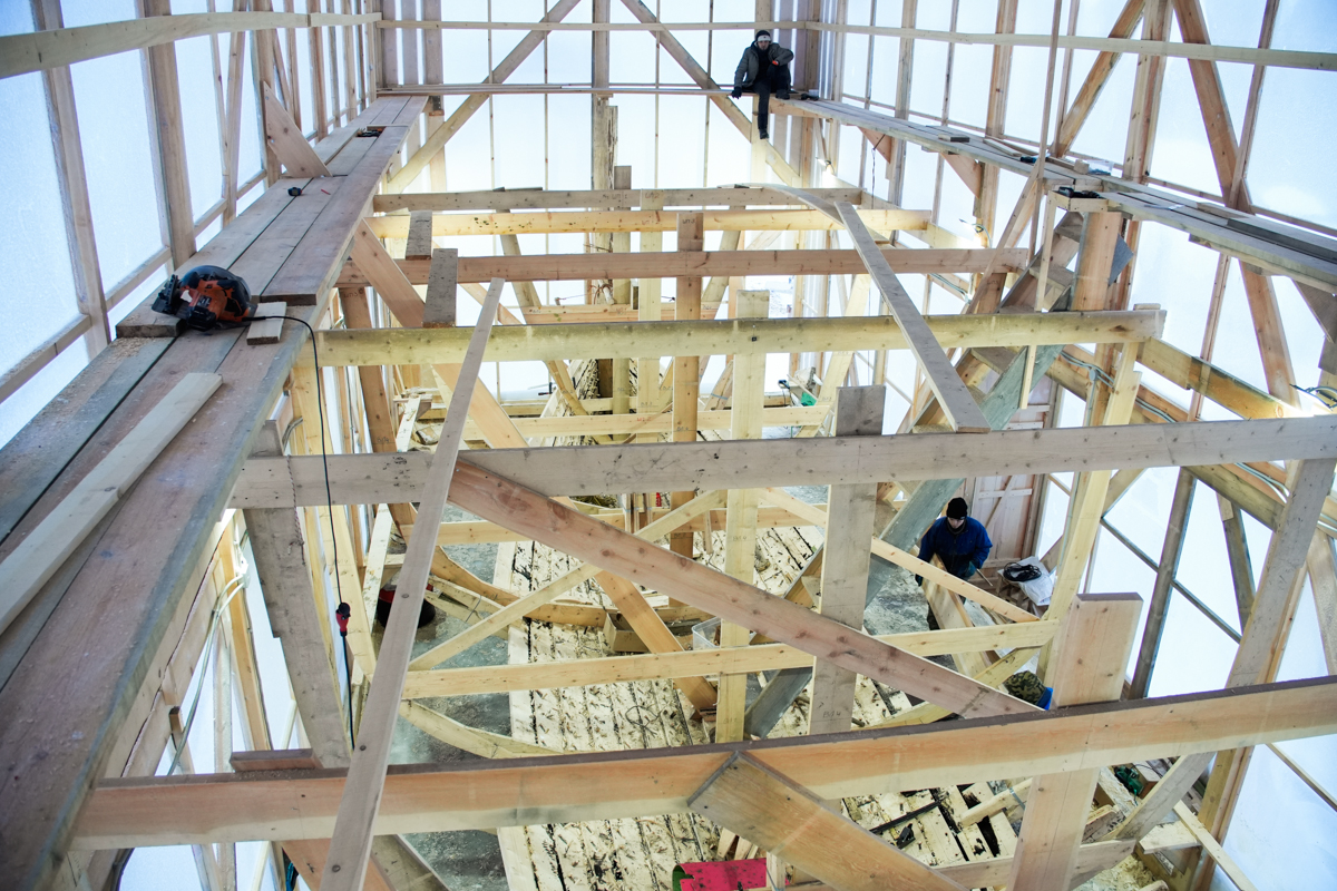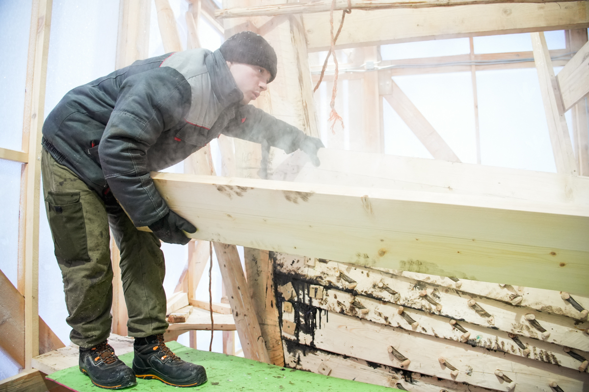 Антон делает под крышей ангара перила (для безопасности) и подвижную деревянную кран-балку — тельфер. С её помощью мы будем поднимать и ставить на коч будущие кокорные шпангоуты.