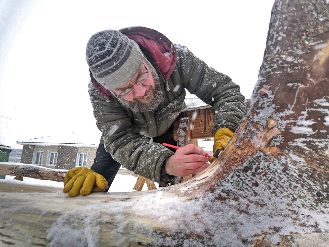 Женя и Оля вытёсывают кокоры — для шпангоута и для бимса.