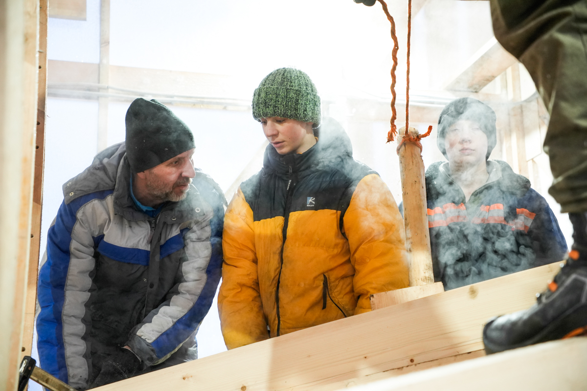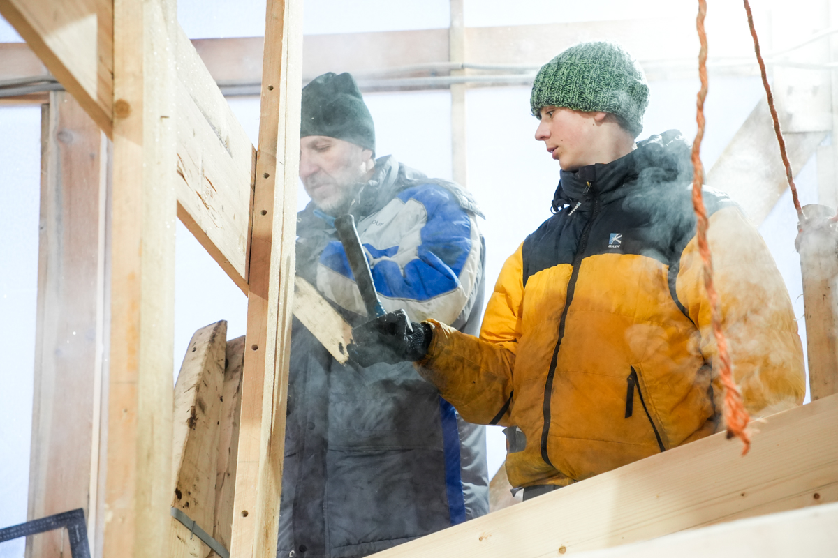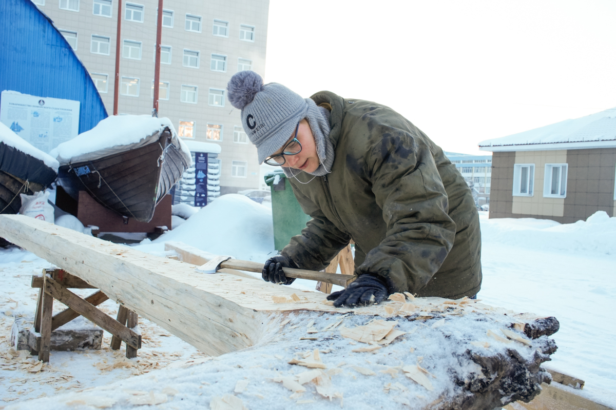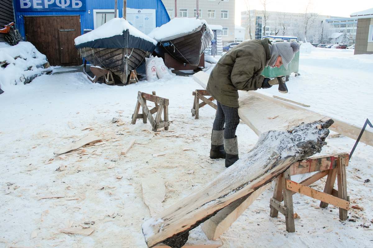 Теперь нам помогают Яна и Иван Пикалёвы из Санкт-Петербурга. Они приехали практически в командировку, потому что школьник Ваня пишет научную работу про поморские кочи. Яна и Ваня пробудут у нас пять дней, чтобы попробовать буквально все работы на нашей традиционной поморской стройке.