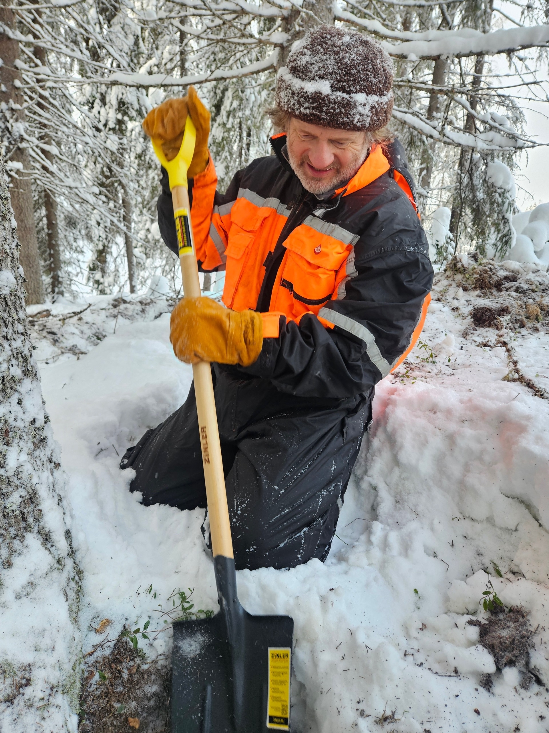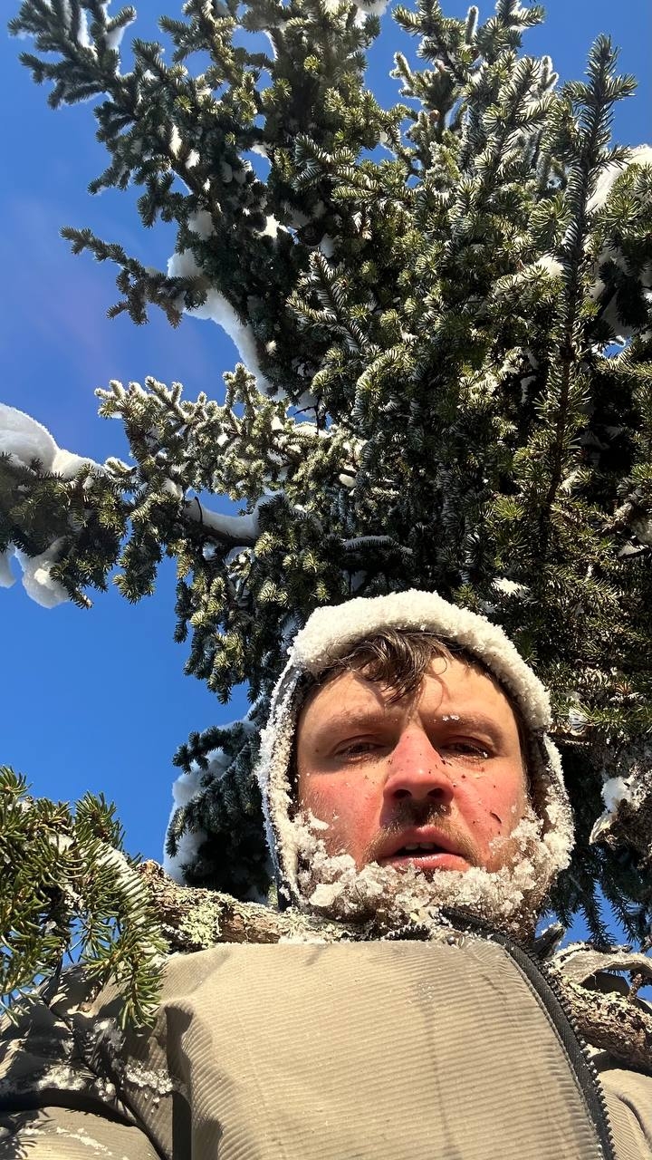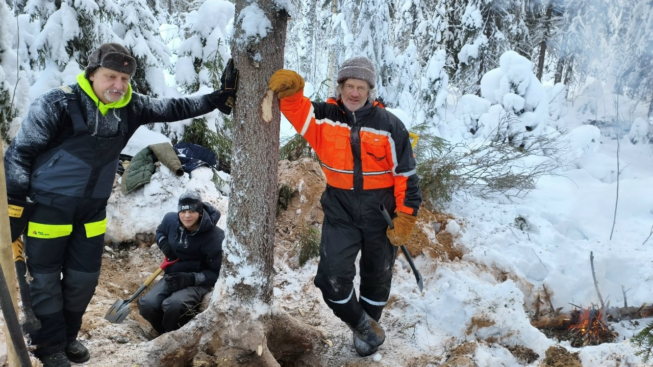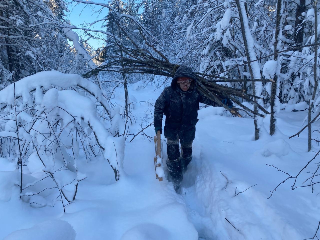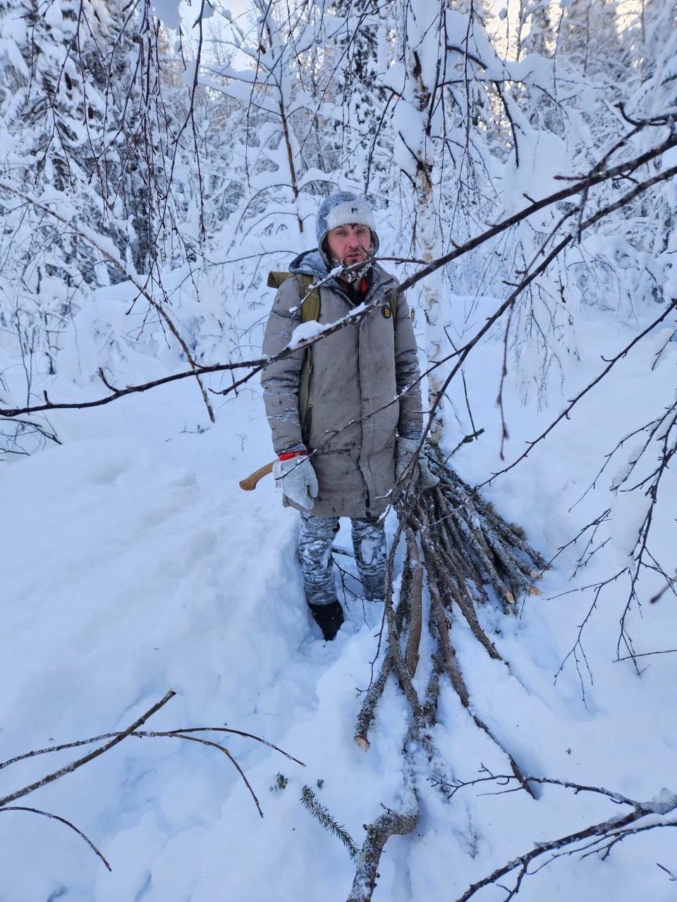 Женя с бригадой волонтеров (Оля Алексеева, Андрей Максименко, Яна и Ваня Пикалёвы) в лесу — добывают кокоры и вицу. Мороз под тридцать!