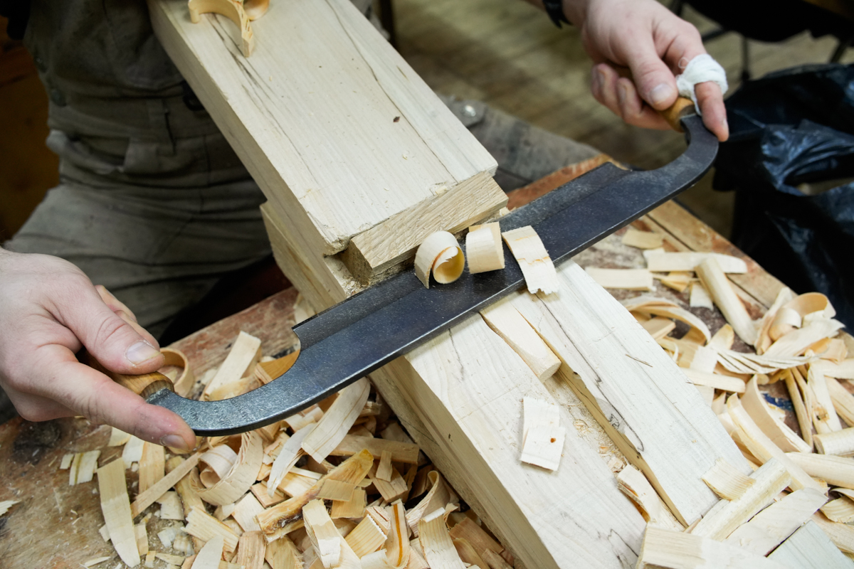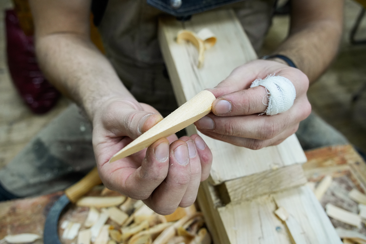 Ваня, как самурай, делает клинышки для стежков вицей на специальной приспособе.