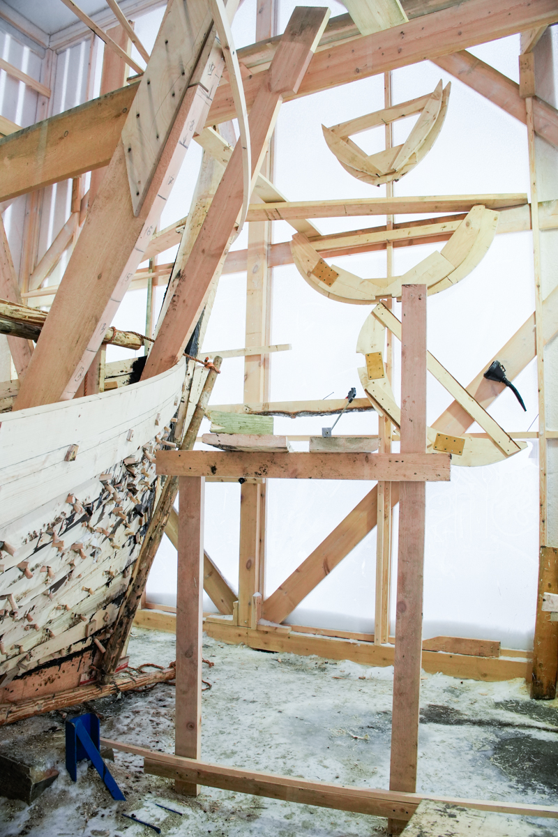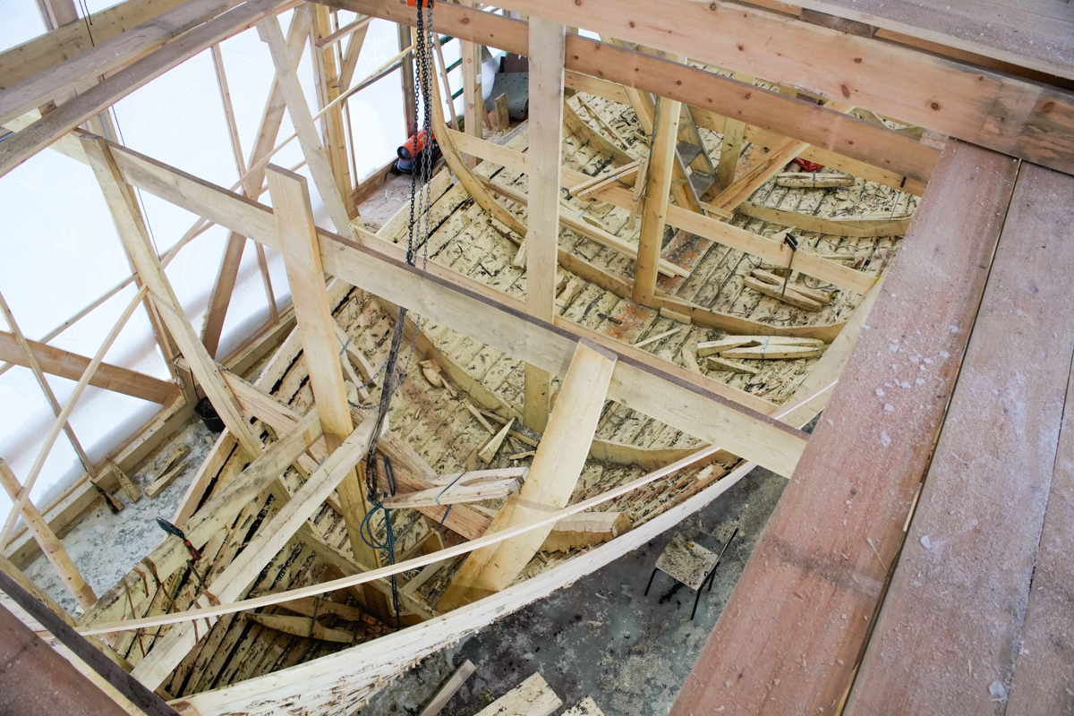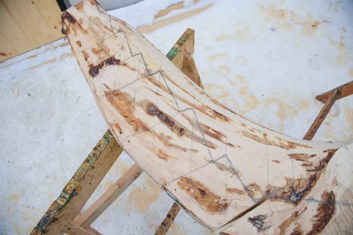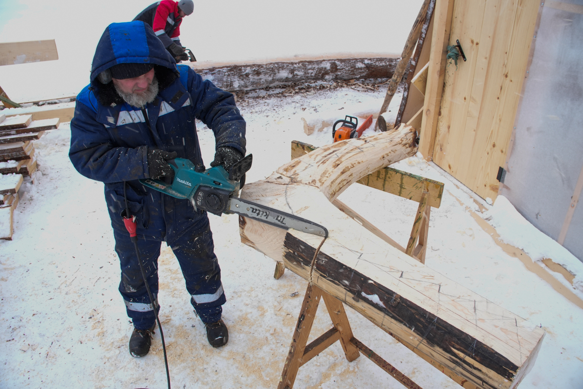 Артём выбирает профили флоров кокорных шпангоутов бензопилой, топором и приглядывает за установкой набоев.