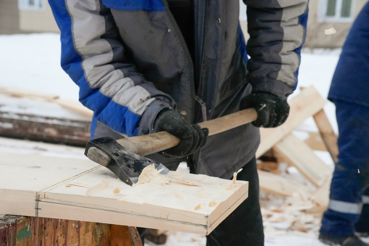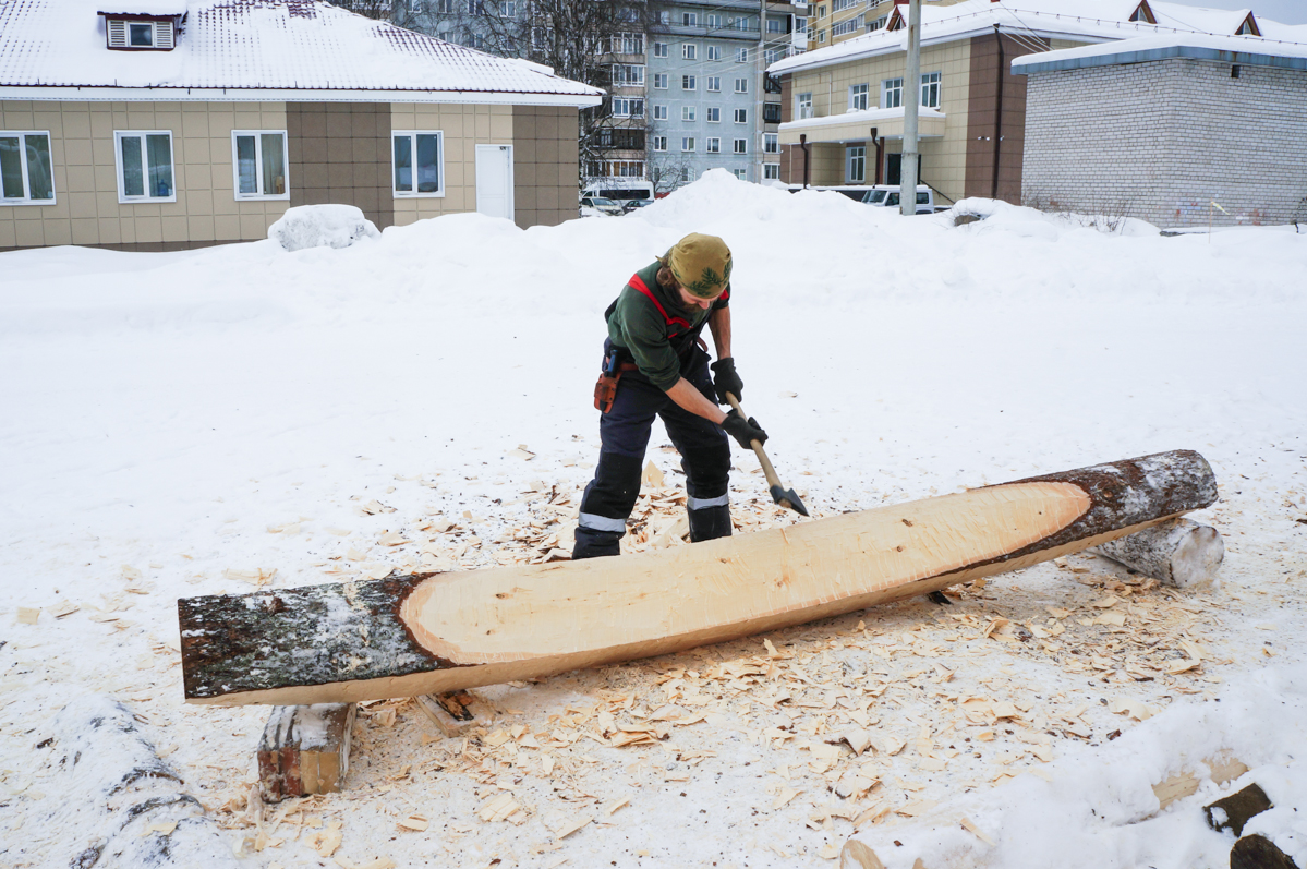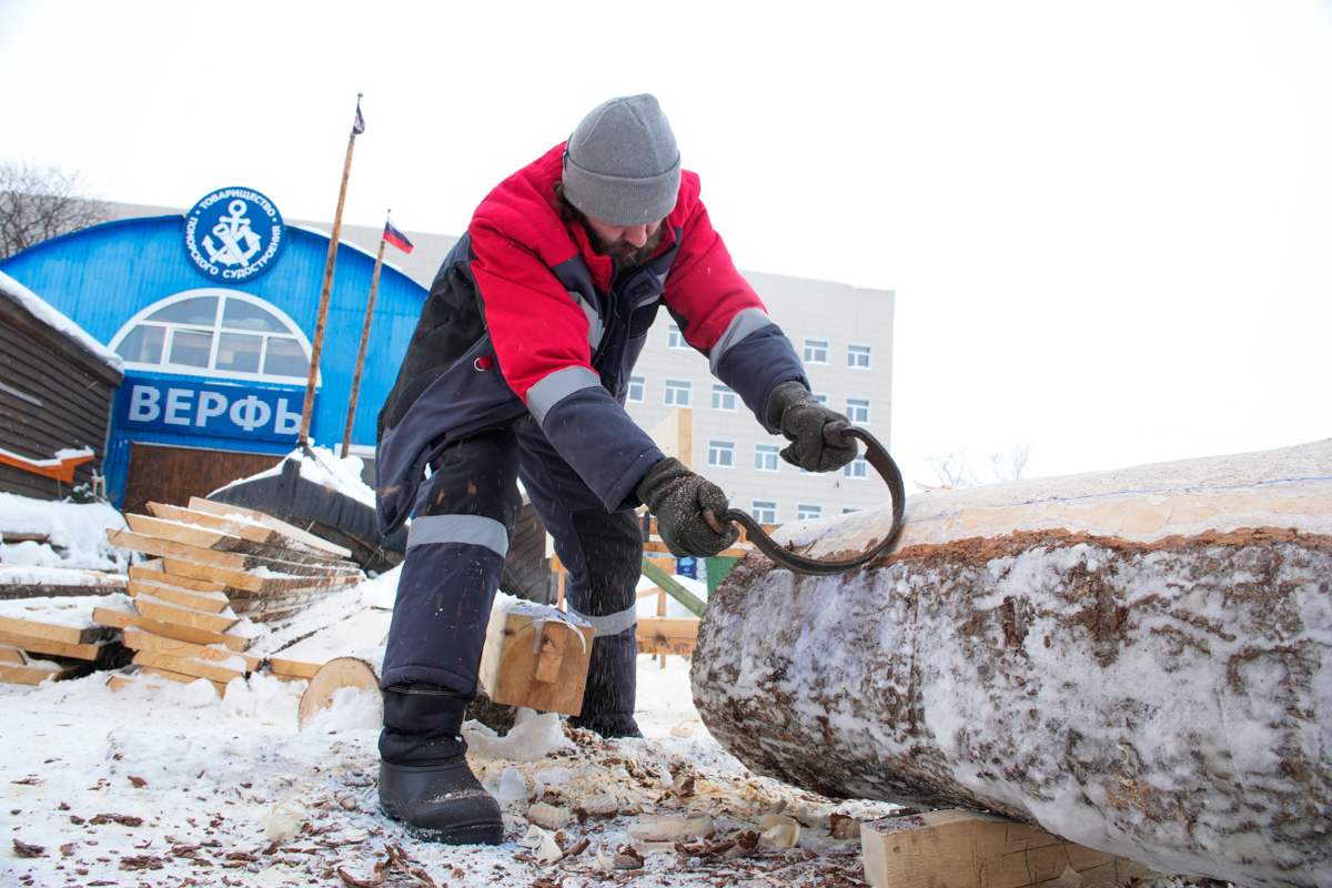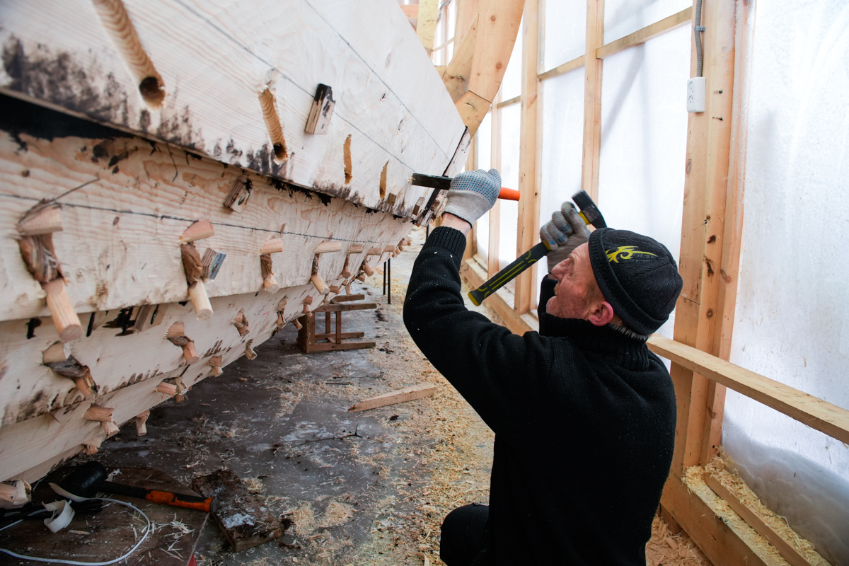 Макс и Егор тешут центральные доски двенадцатого набоя коча.