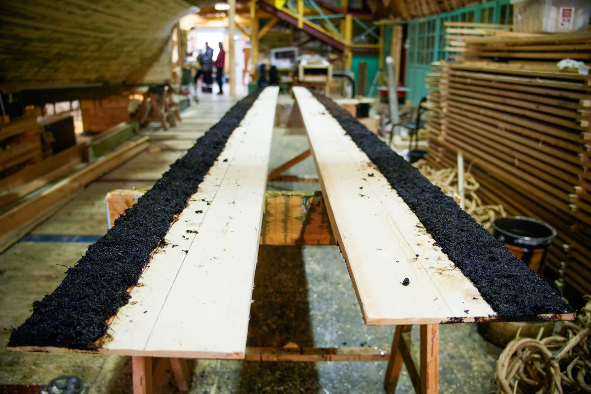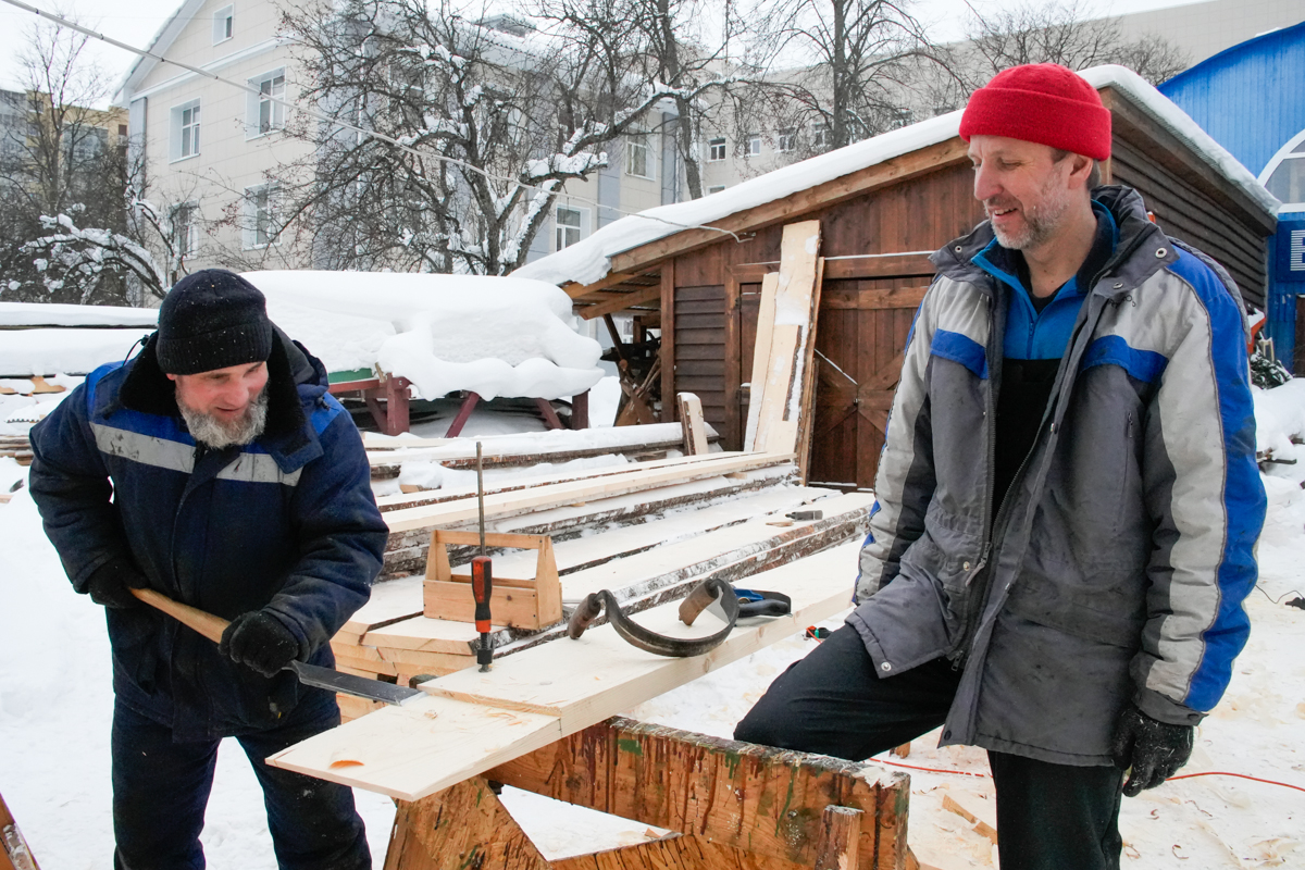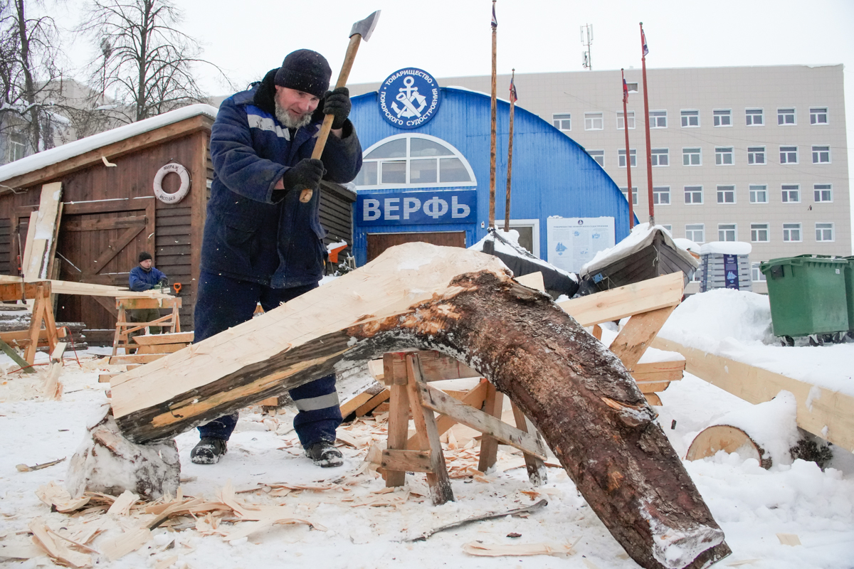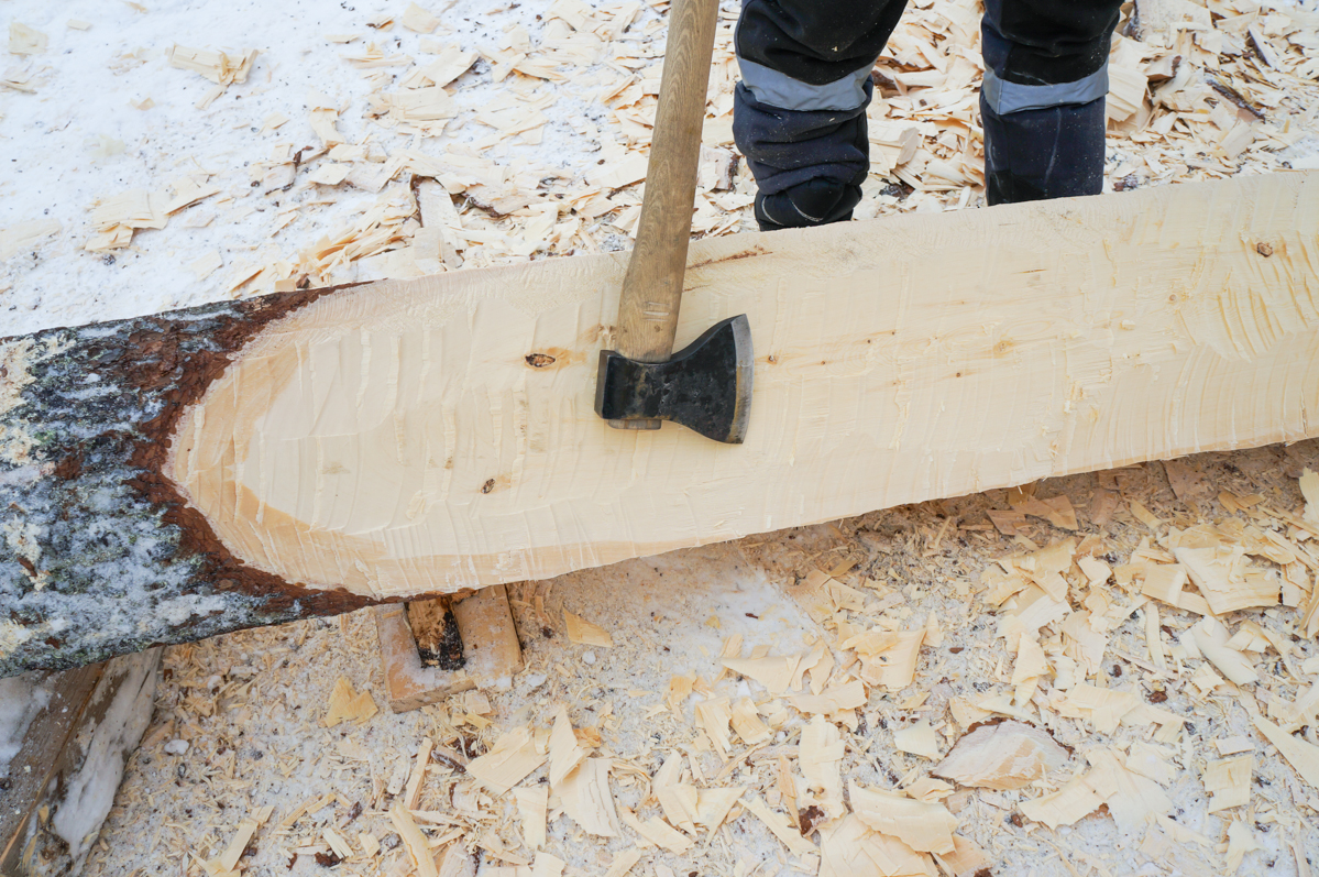 Макс и Егор тешут центральные доски двенадцатого набоя коча.