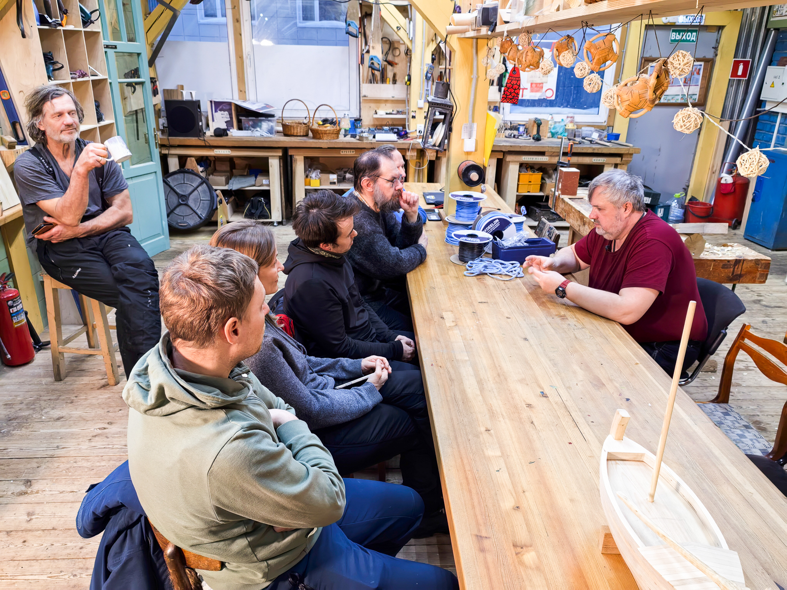 Он решил быть там, где сможет принести наибольшую пользу, и остался на верфи: для начала готовить оленину (вымачивать в уксусе с солью, трижды жарить до срабатывания сигнализации, закидывать в чан с поджаркой и рисом — команда накормлена и довольна), а вечером — проводить мастер-класс по вязанию узлов и созданию прочих чудес из своих сверхпрочных канатов Deelon (расскажем об этом отдельно).