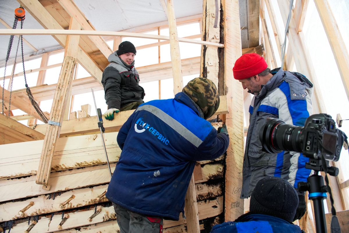 Максим Матвеев за три недели на стройке коча не растерял ни капли своего энтузиазма. Сегодня они с парнями ставят кормовые доски тринадцатого набоя на мох и смолу. Макс всё ещё поминает недобрым словом большие московские стройки и говорит, что все строители попадают в рай, потому что через ад они прошли ещё на земле, на работе — и строгает доски, совершенно счастливый.