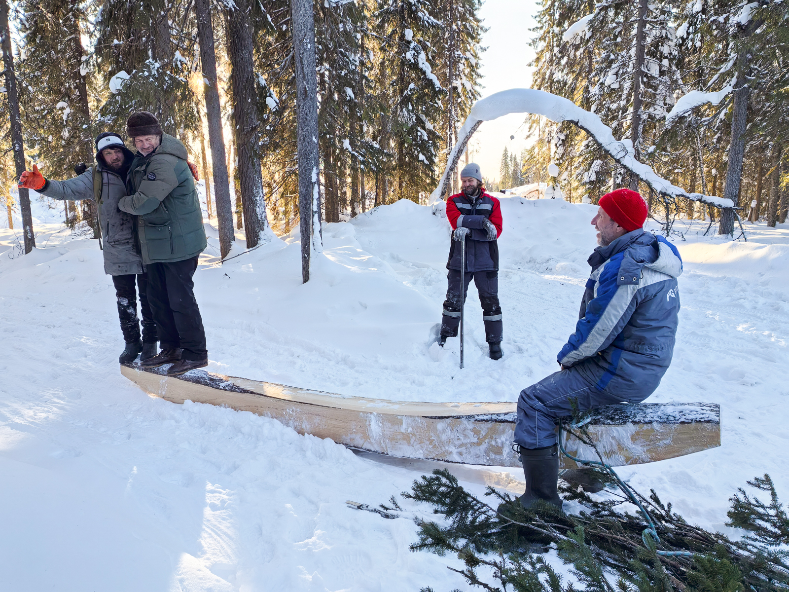 Женя с Максом, Антоном, Чифаном, Вадимом и Виктором в лесу, ищут кокоры и «бананы» для шпангоутов и донных флоров.