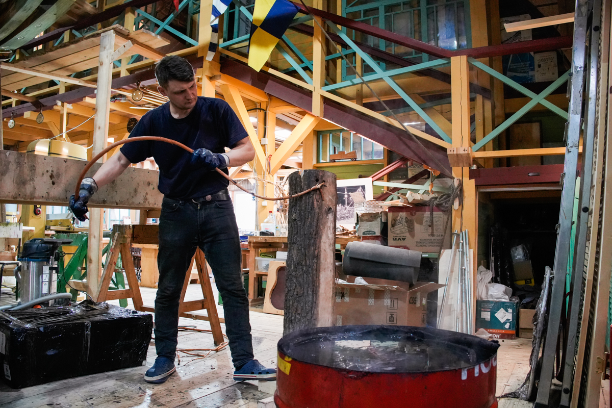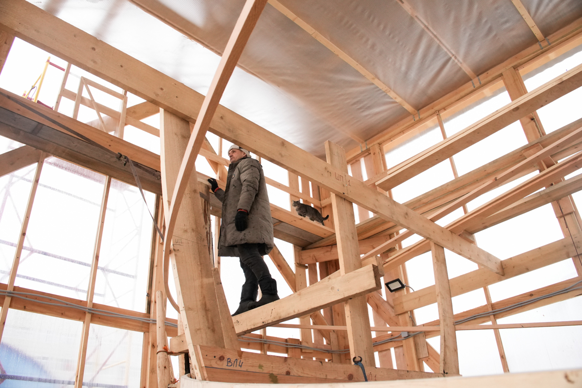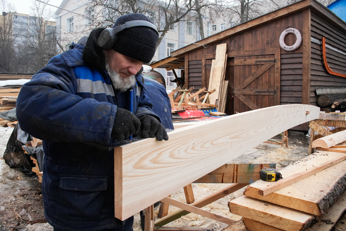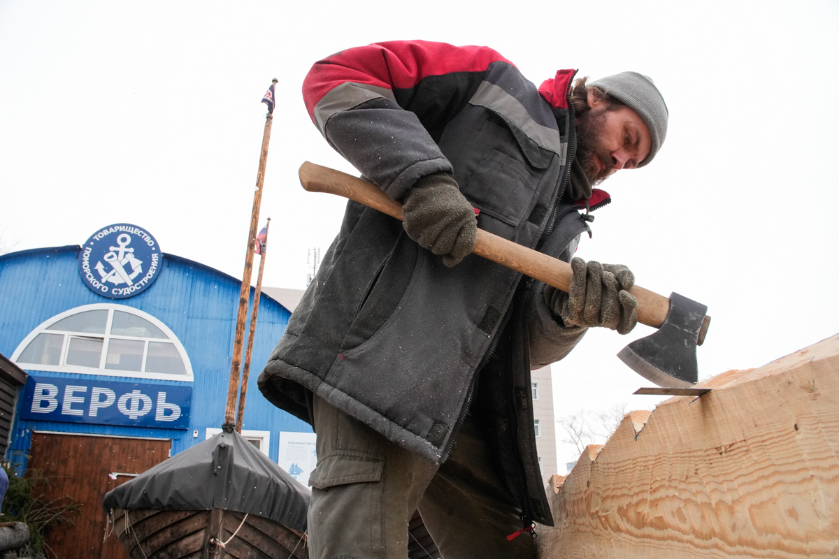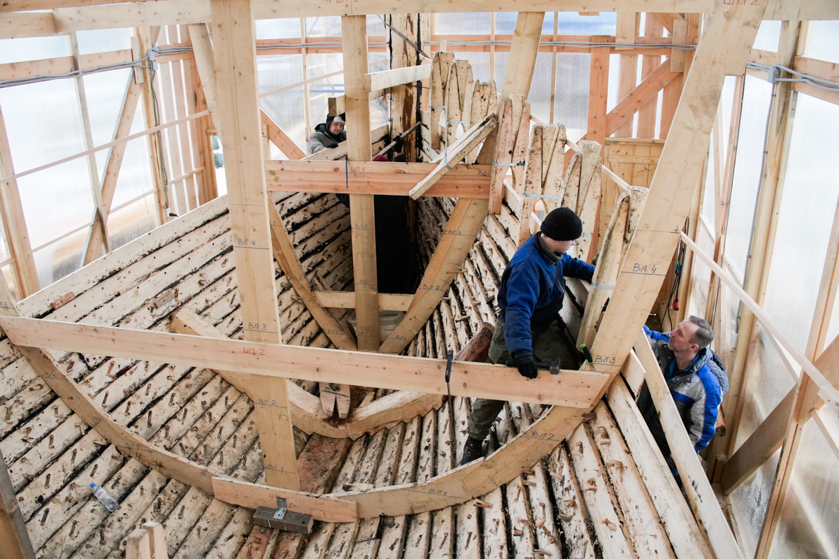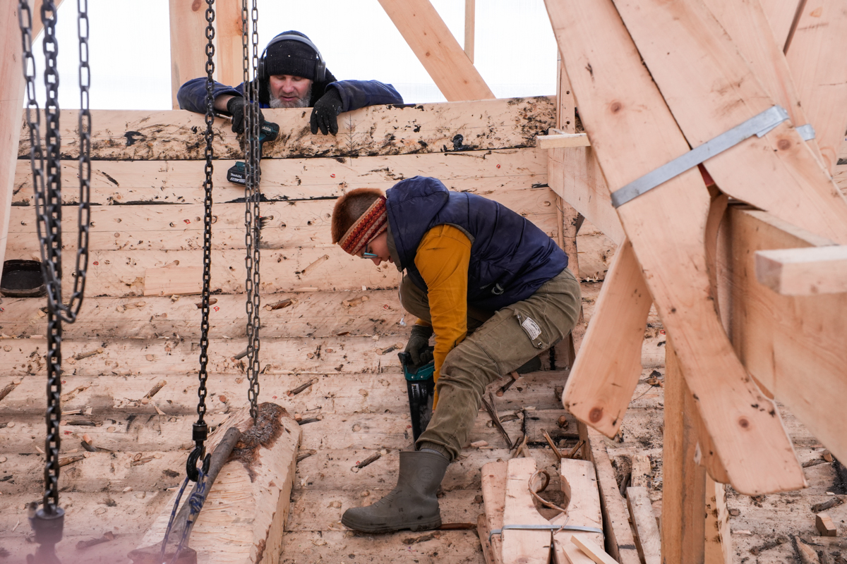 На этой неделе завершают свою работу на верфи волонтёры Александр Лихачёв (лётчик) и Илья Сабанцев (шкипер и предприниматель). Саша и Илья — друзья Лёши Перевалова, приехали к нему в гости. Ни на какую вицу он их не продал, ребята вместе с Лёшей делали обшивку поморской шхуны, только Саша ещё разделил с нами выезд в лес за кокорами, успел буквально в последний вагон.
