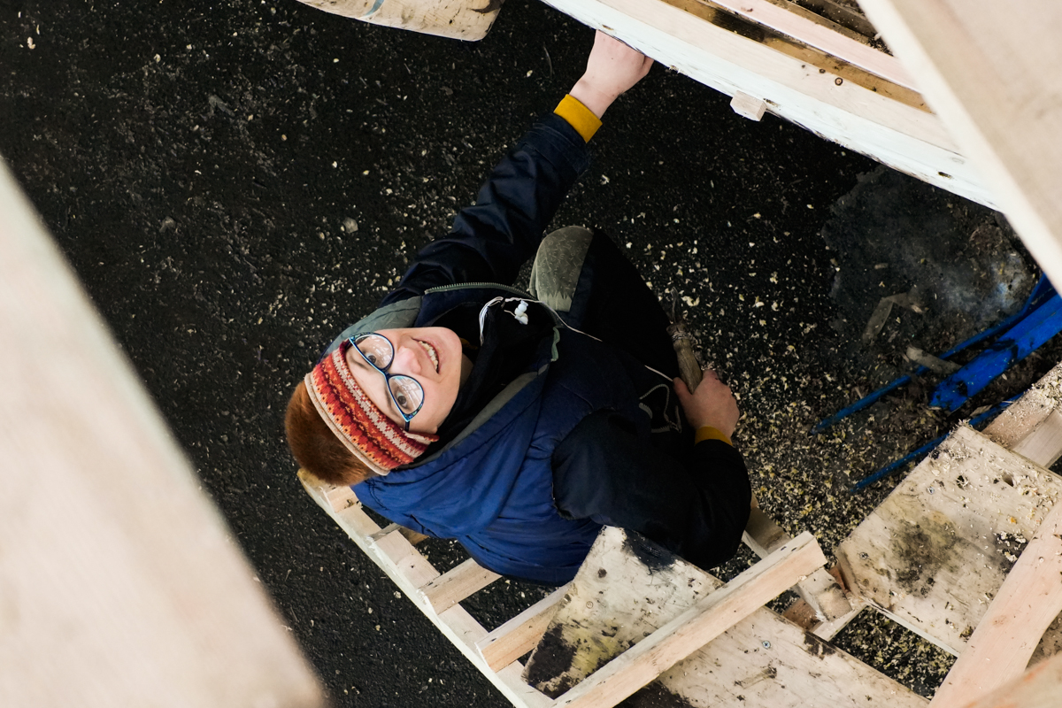 Оля срезает концы клиньев, которыми подбиты стежки вицей внутри коча. Это в большей степени забота о клиньях, чем о ходящих внутри коча, но и ходить без них тоже гораздо удобнее.