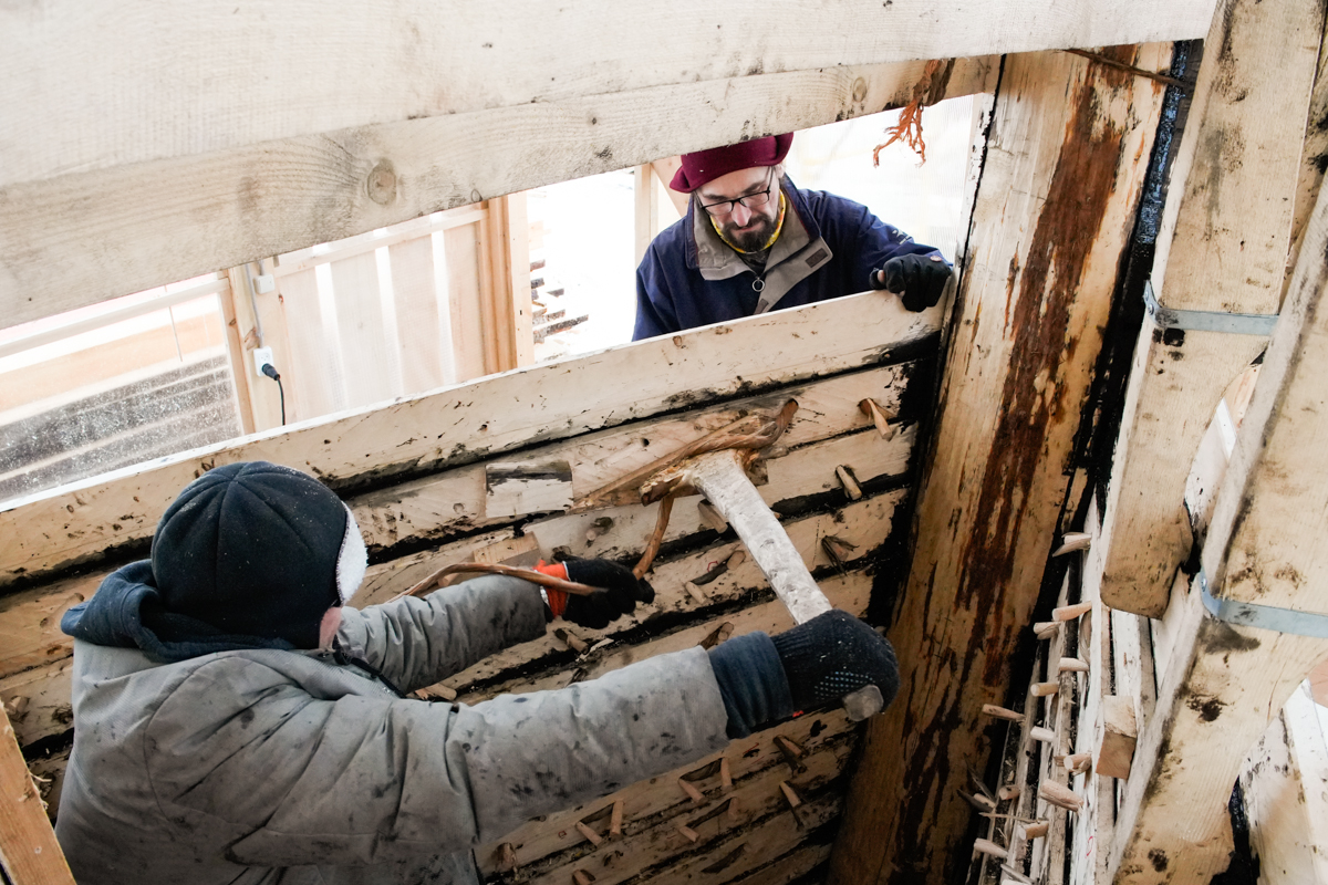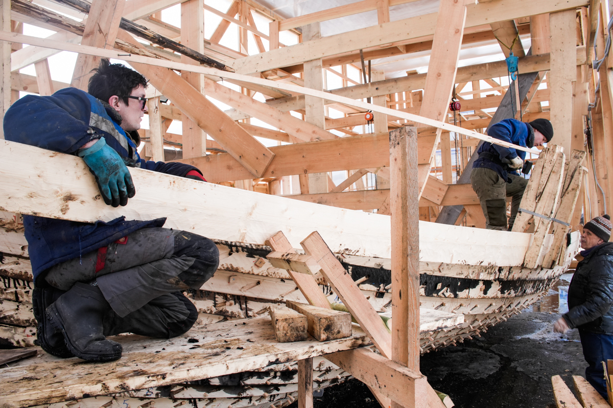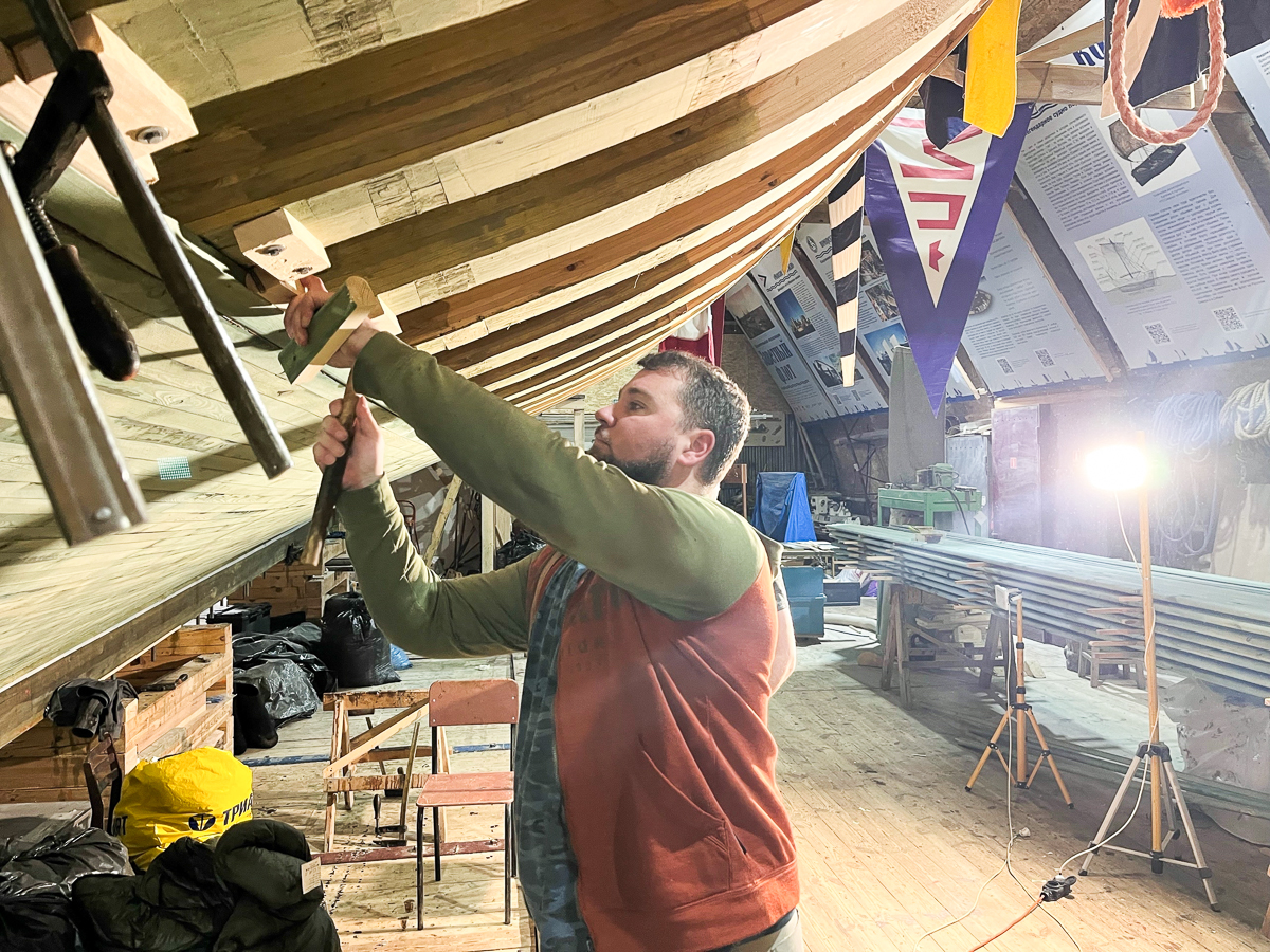 Егор, Артём Калинин и Саша-механик ставят кормовые доски пятнадцатого набоя.