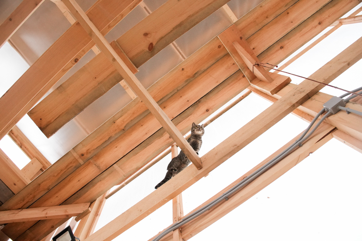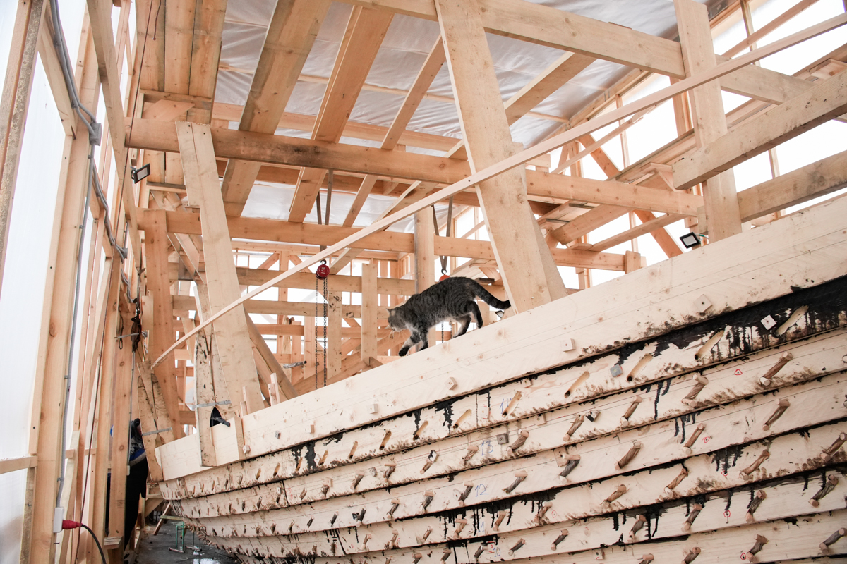 Между тем, кошка Муся, вышедшая с потеплением на просторы вокруг верфи, познала ангар. Раньше она в нём не бывала, а теперь вот зашла и была потрясена. Она ходила по всем доскам, балкам и перекрытиям до самого потолка, непрерывно мяукая, и, видимо, возмущаясь тем, что это мы тут на неё прятали и чем, оказывается, занимались всё это время.