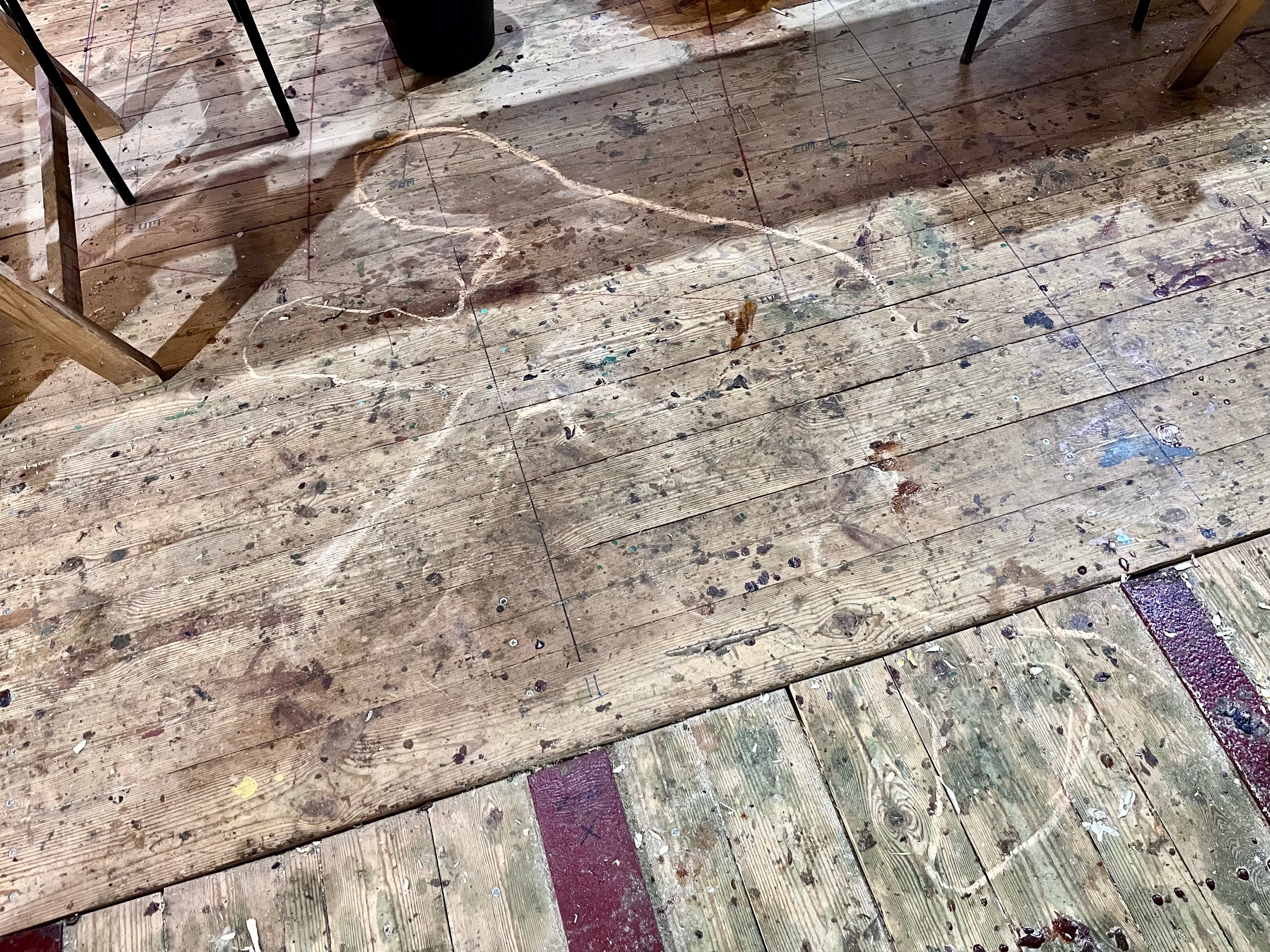 Добрые и заботливые наши коллеги нарисовали на полу Лёшин силуэт, чтобы не отвыкать от друга и товарища, пока он находится в починке. Поправляйся, Лёша!