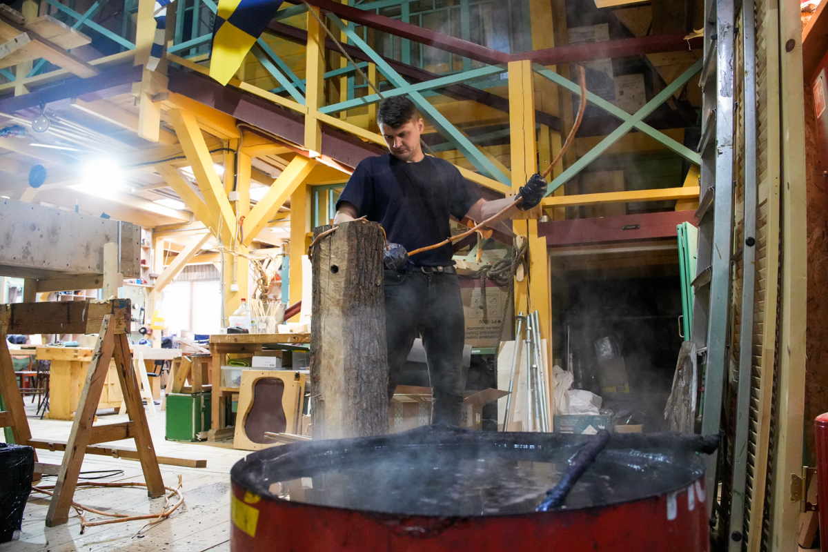 Антон встал к станку (котлу и бревну), чтобы пополнить их запасы.