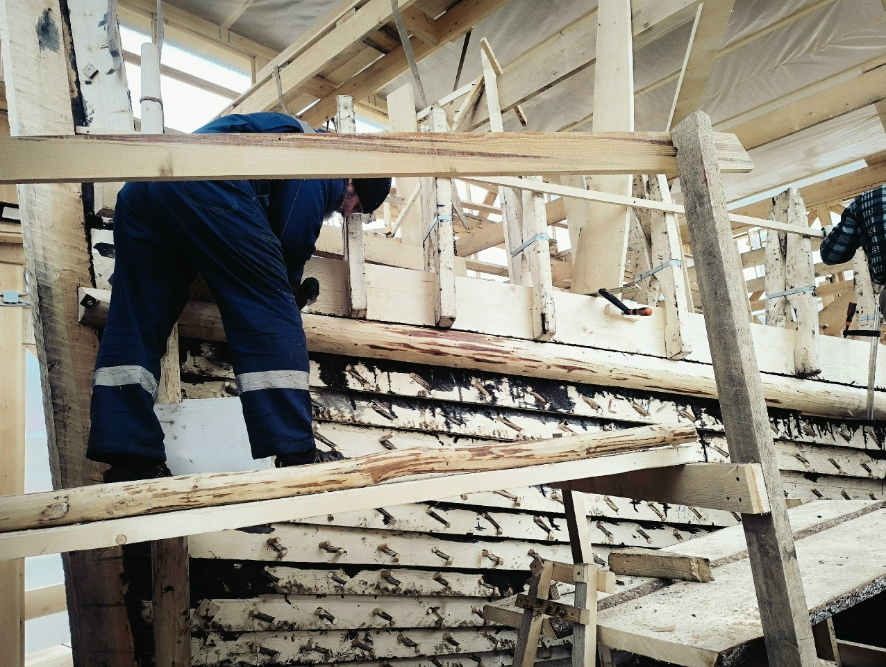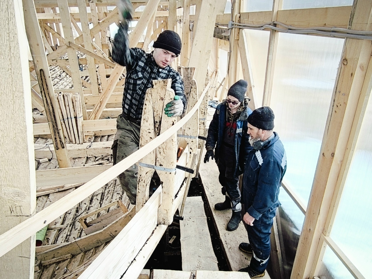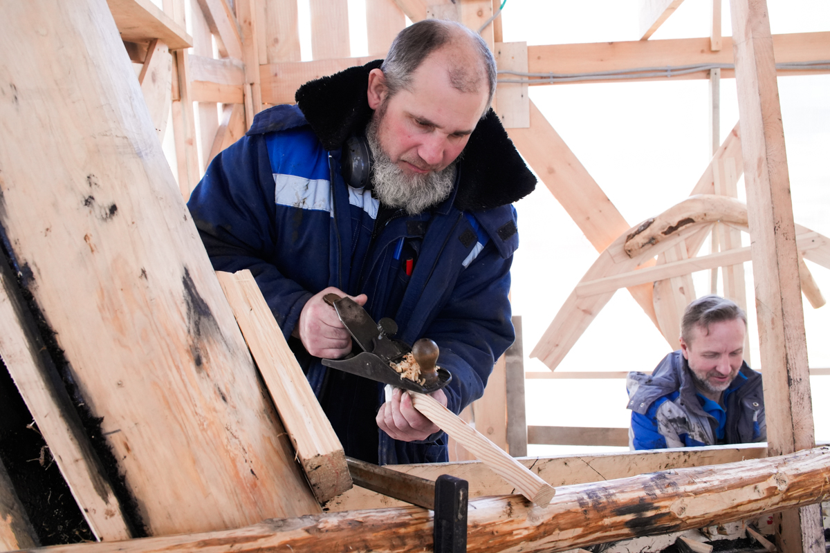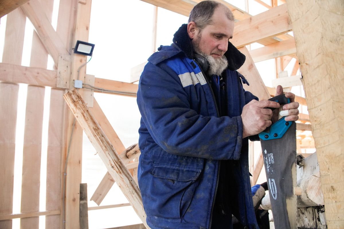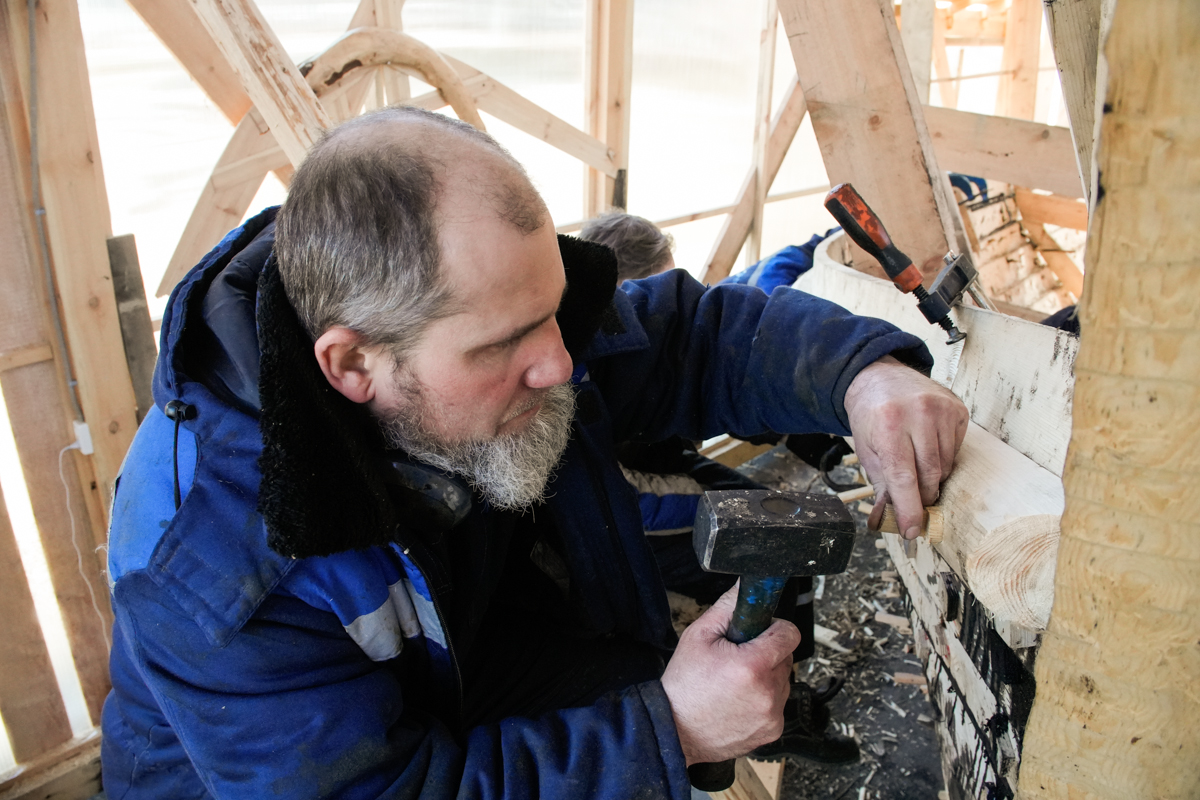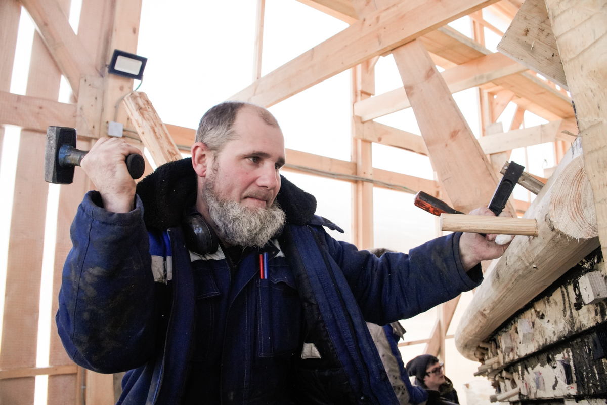 Антон укрепляет кондукторы коча, чтобы их не повело от нагрузки, которую создаёт обшивка. Лазает по лесам, как его верная подруга кошка Муся.