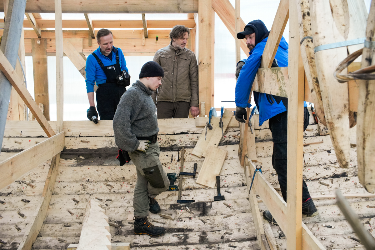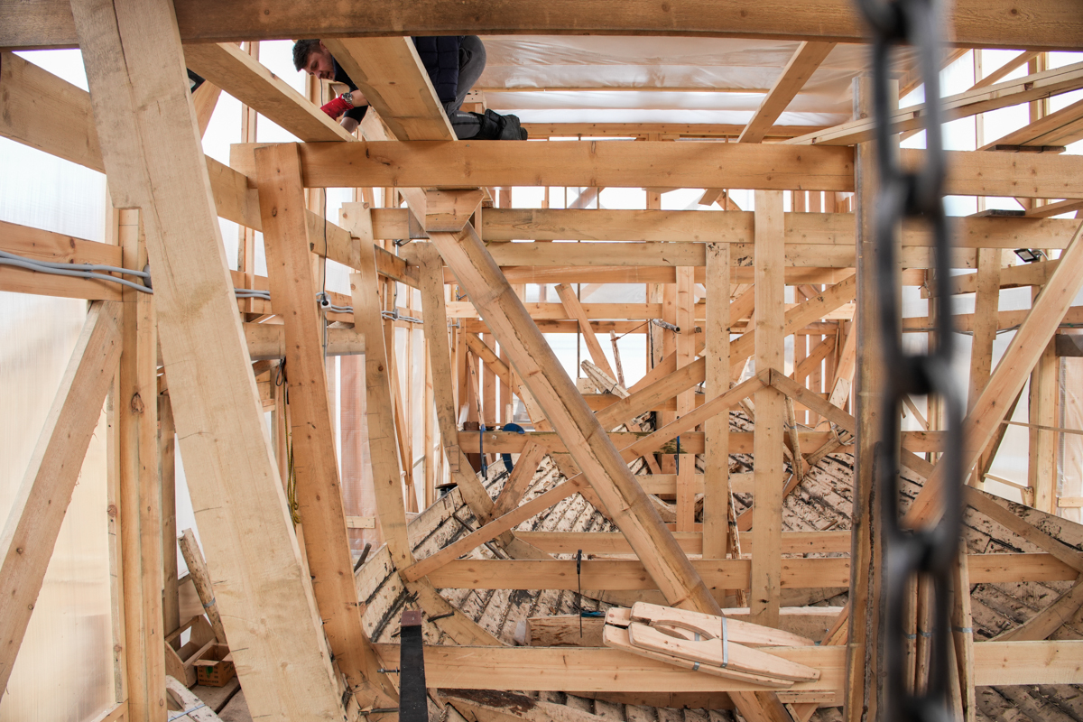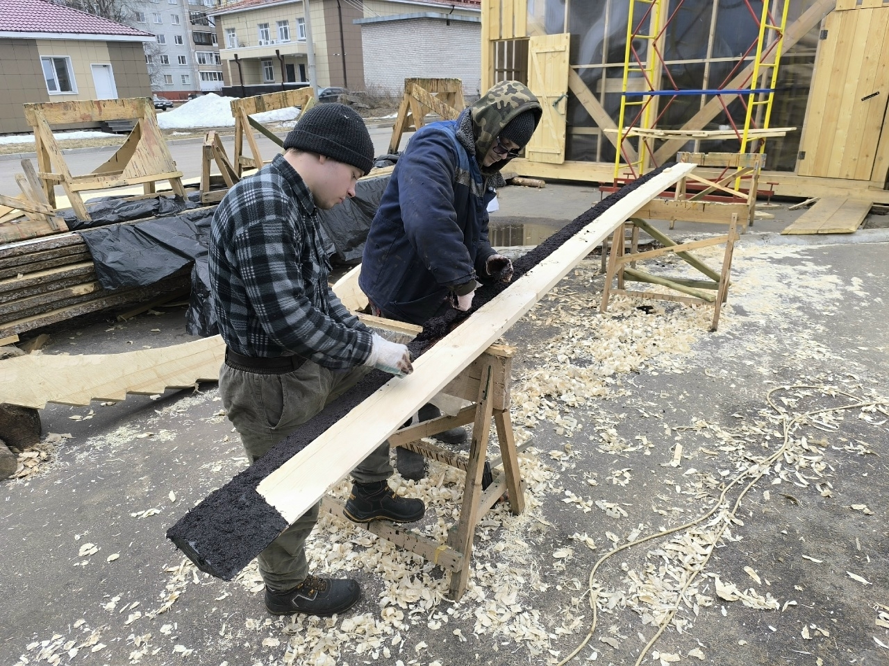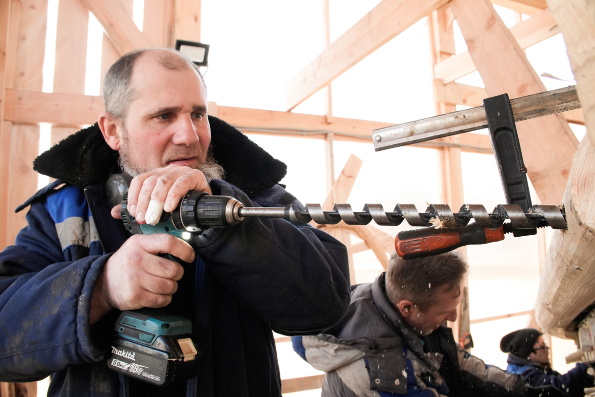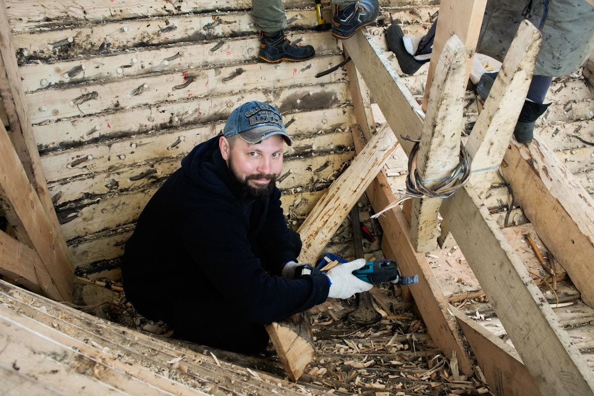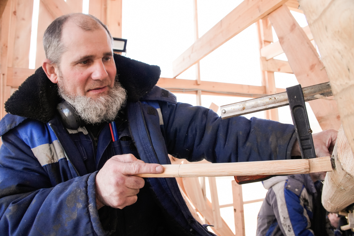 Антон укрепляет кондукторы коча, чтобы их не повело от нагрузки, которую создаёт обшивка. Лазает по лесам, как его верная подруга кошка Муся.