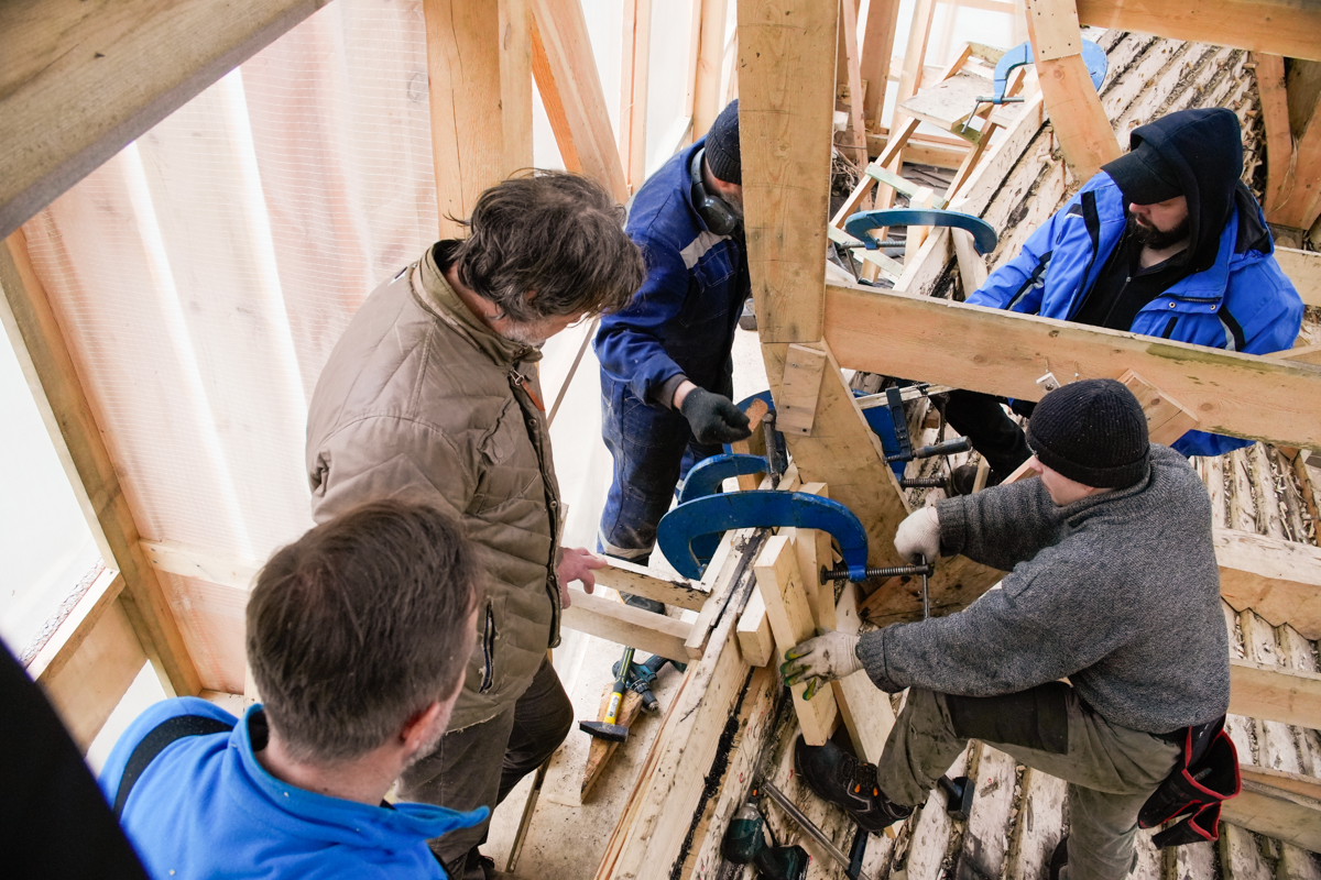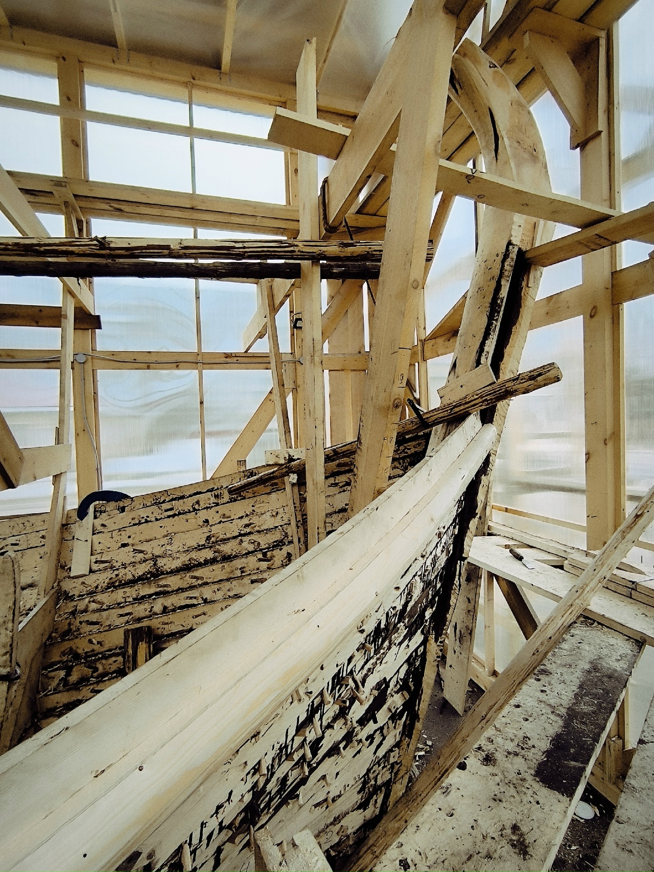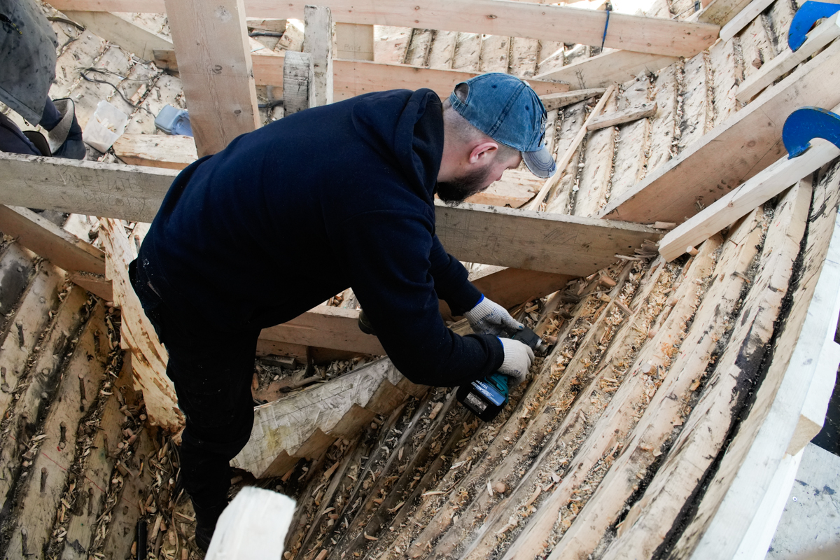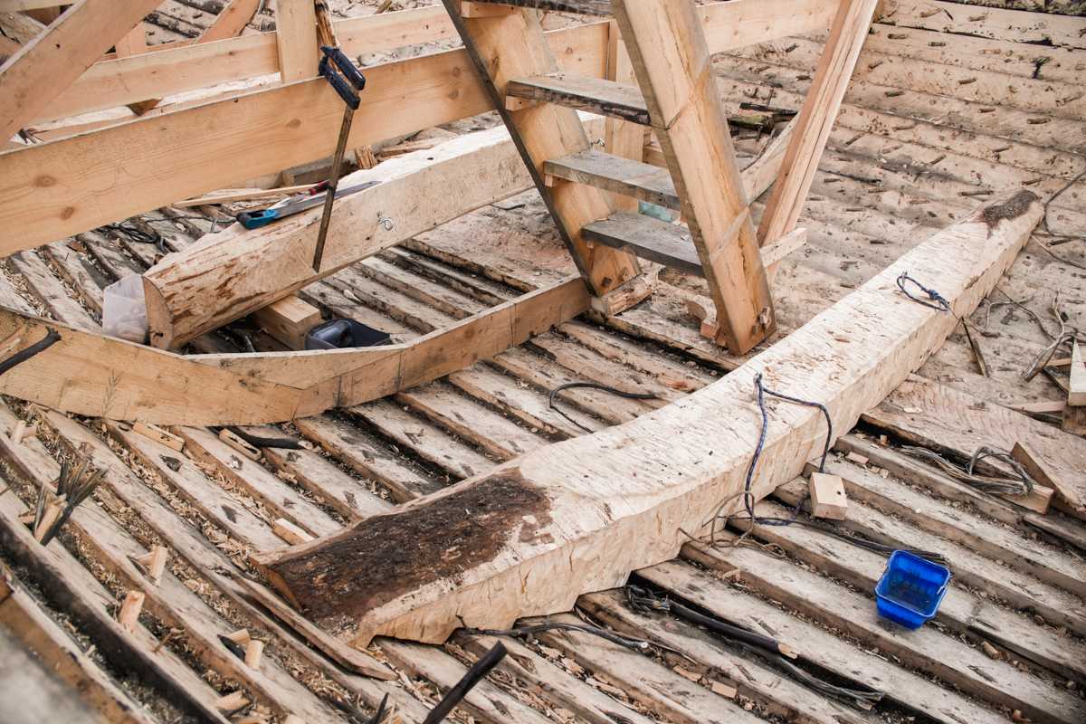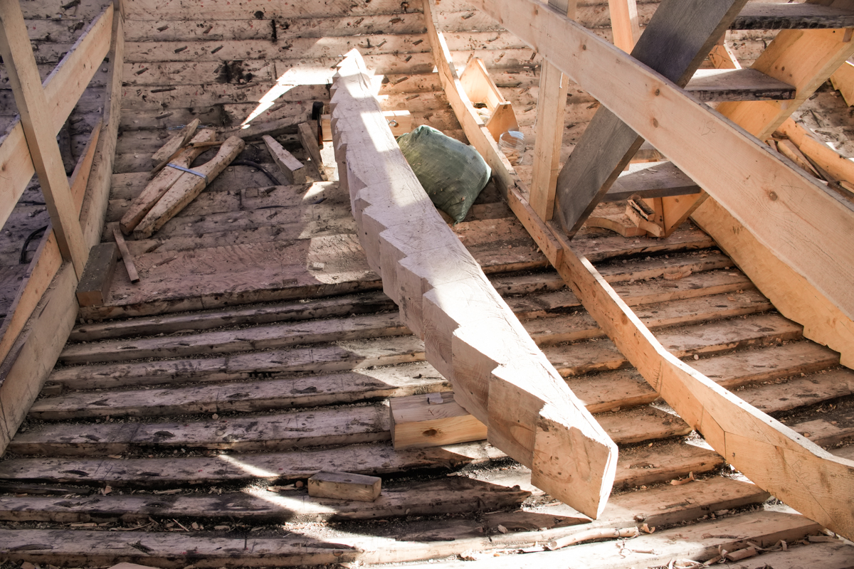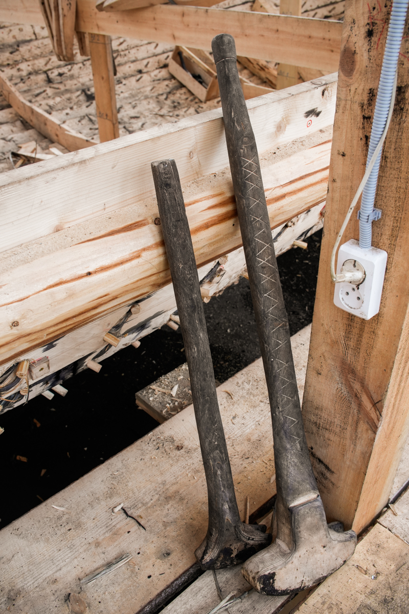 Антон укрепляет кондукторы коча, чтобы их не повело от нагрузки, которую создаёт обшивка. Лазает по лесам, как его верная подруга кошка Муся.