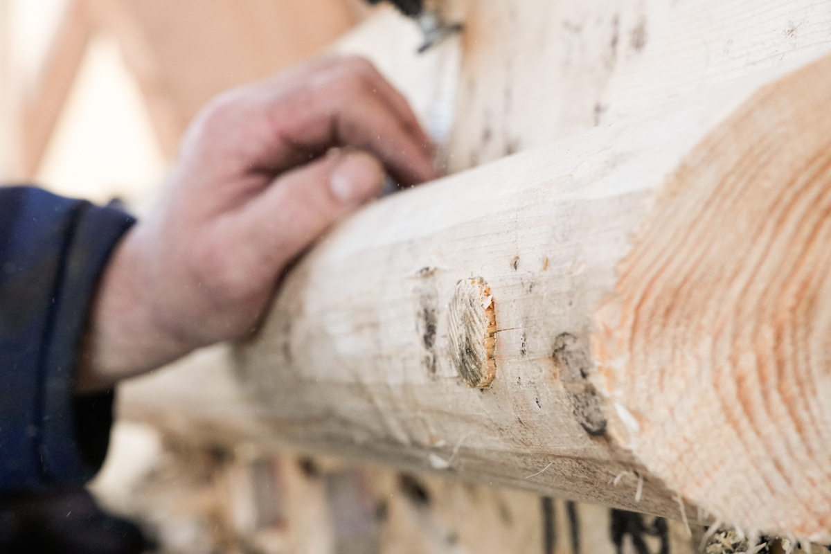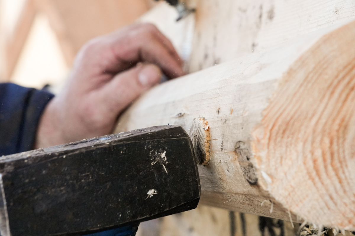 Артём, как и собирался, сверлит привальник и забивает в него нагеля с клиньями (тут же изобретён окказионализм «нагелировать»).