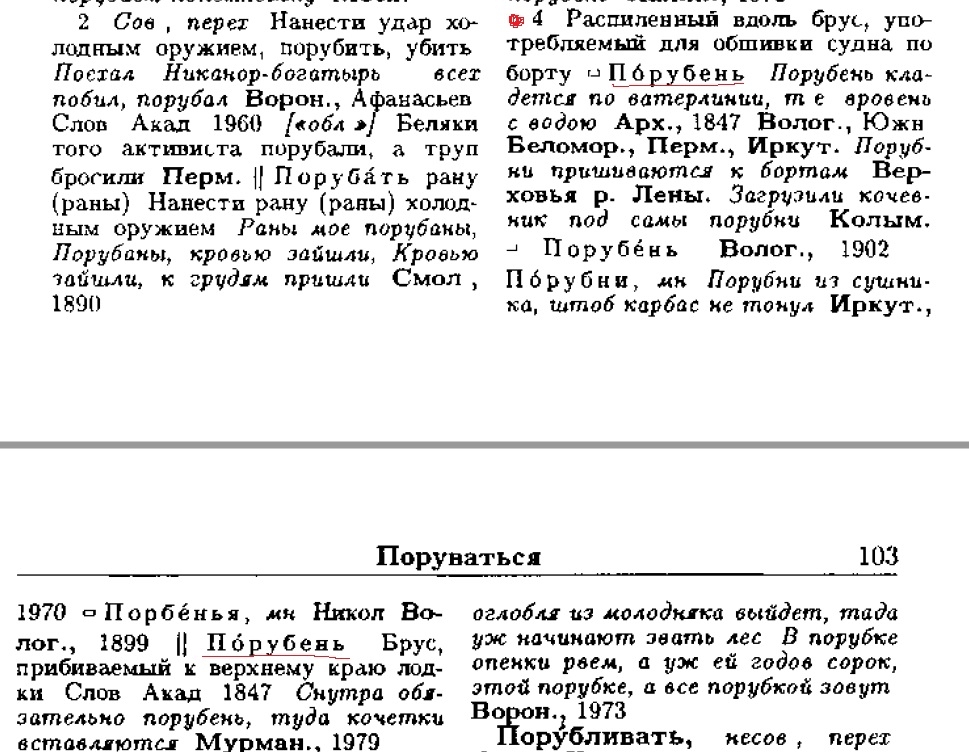 Кстати о терминологии: Сергей Кухтерин прислал ссылки, согласно которым привальный брус или, как было принято на Поморье говорить, порубень называли еще и бархотом. В классическом деревянном судостроении бархоут — утолщенная доска обшивки в районе ватерлинии или выше. Там, где на корпус приходили повышенные нагрузки от контакта с причальной стенкой, нужно было ставить более толстые доски. Но можно было поставить и привальный брус (полбревна). Это удобно на случай, если нужно поменять одну изношенную деталь на другую. Вот так — правильно будет сказать, что мы поставили привальный брус или порубень или бархот.