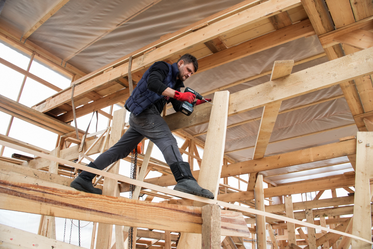 Оля Кузнецова и Миша Белайчук ныряют под леса и забивают чопики в отверстия из-под временных саморезов где-то глубоко на дне ангара.
