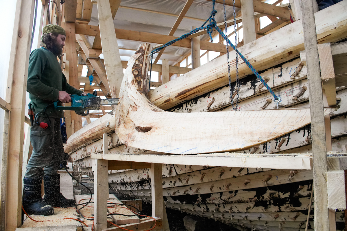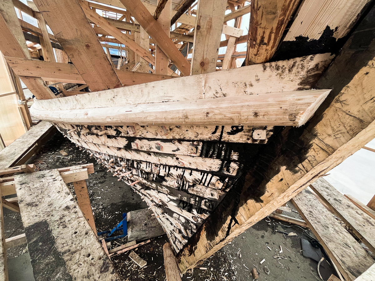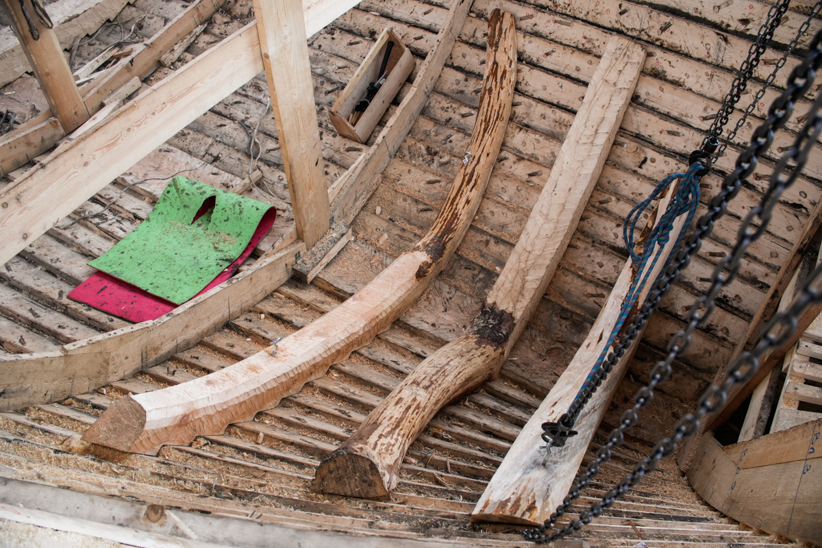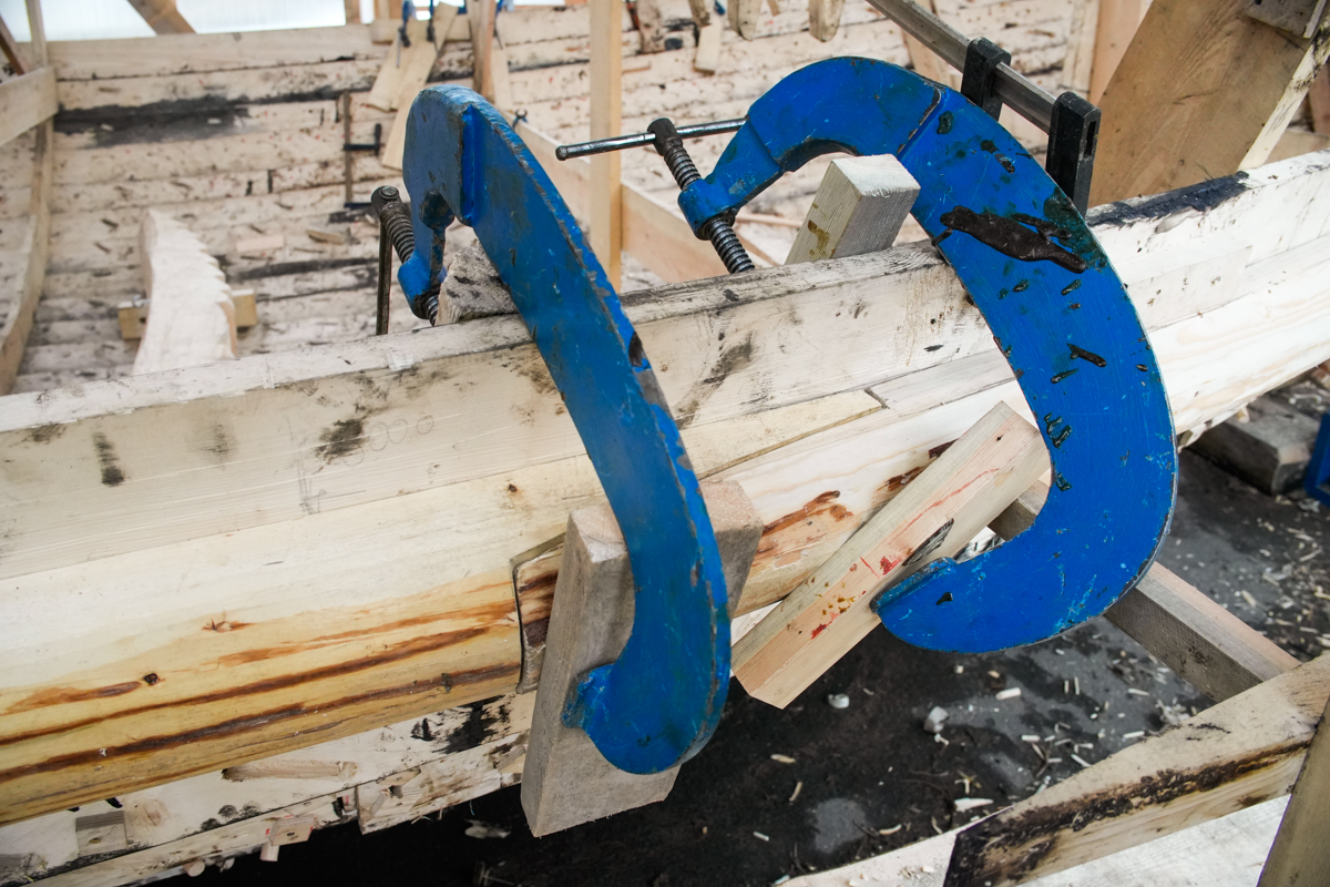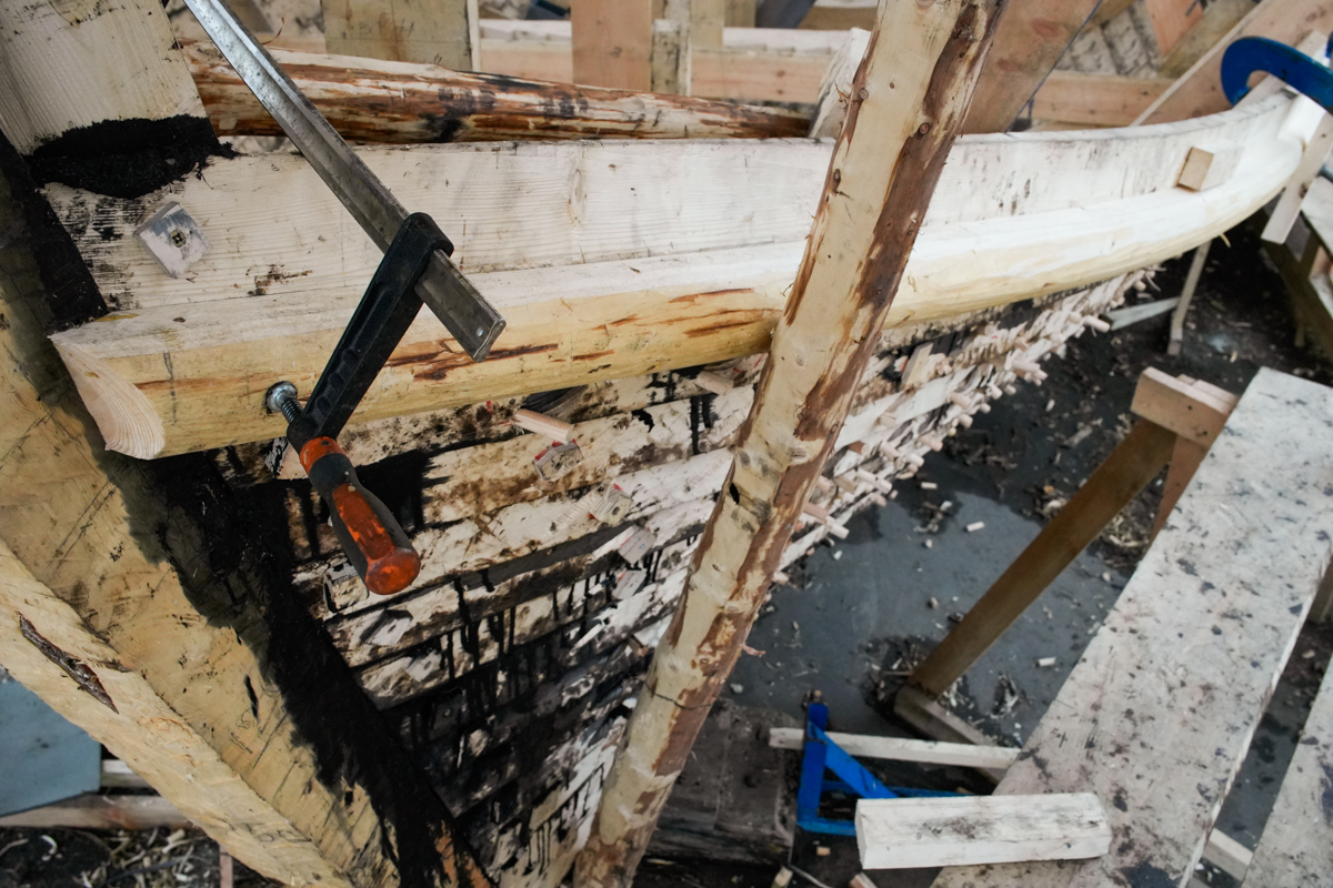 Закончили ставить порубень (он же привальный брус и бархот) на пятнадцатом набое. Две недели ушло, чтобы его поставить: распарить, пригнуть шесть деревяшек и дошить вицей все, что было не дошито. Сразу после привальника начали ставить шестнадцатый набой. Поставили две кормовые доски. Это мастерство нам хорошо знакомо.