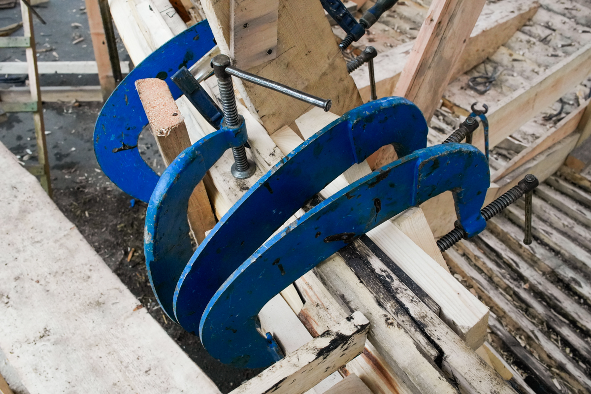 На фотографиях можно наблюдать буквально военный совет. Стык двух частей бруса зажимают сразу пять больших металлических струбцин со сложной комбинацией из досок-прокладок.