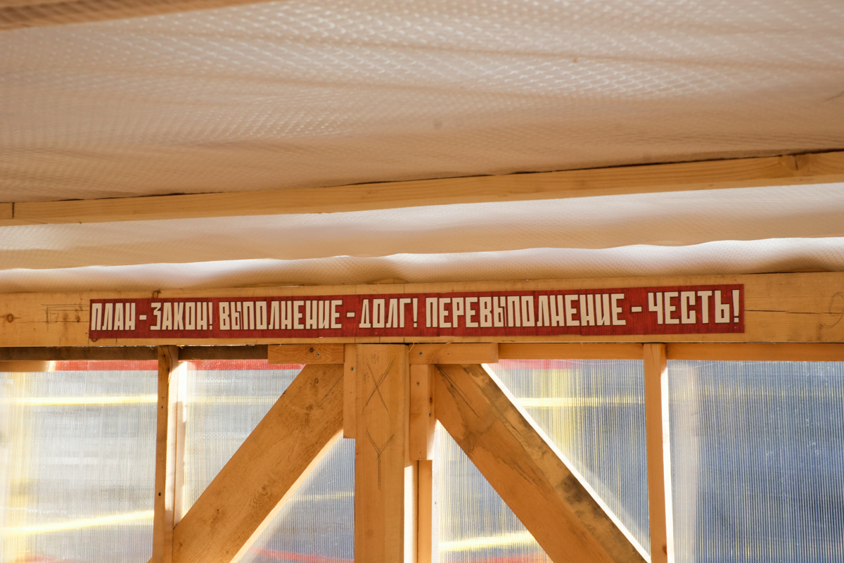 Под потолком ангара с кочем появилась агитационная растяжка, гласящая: «План — закон! Выполнение — долг! Перевыполнение — честь!»