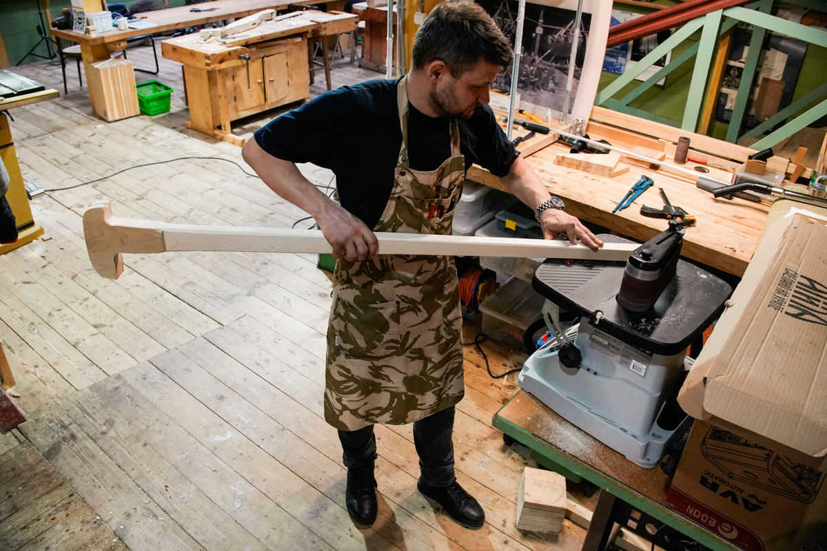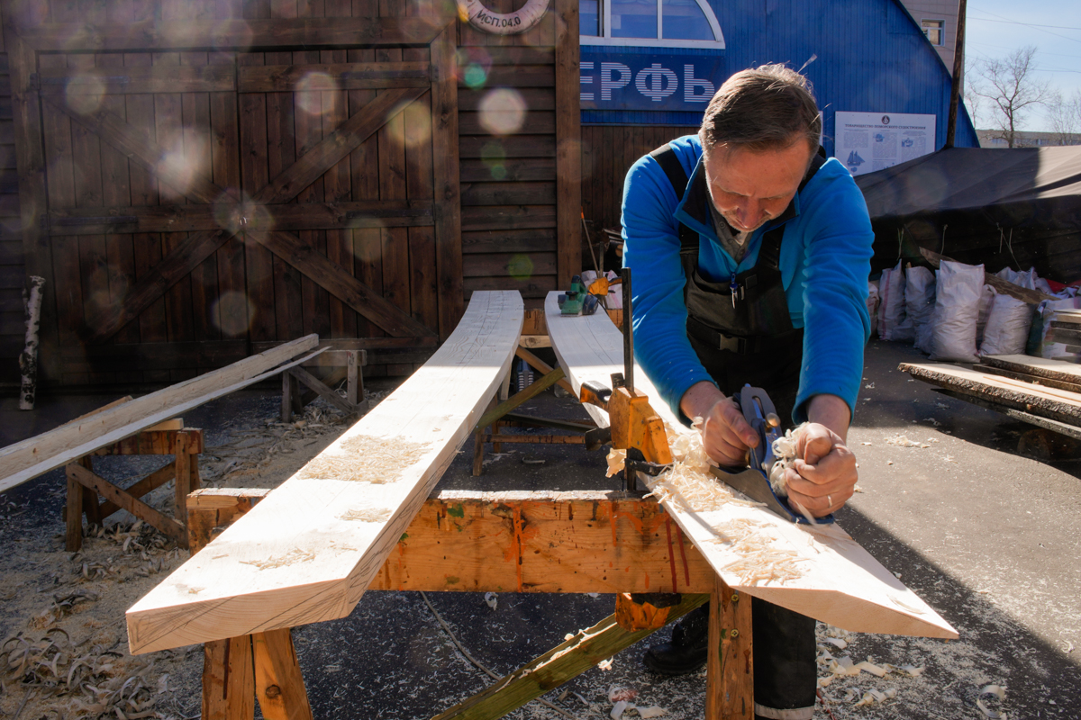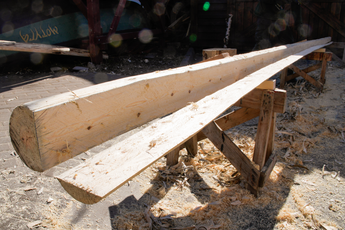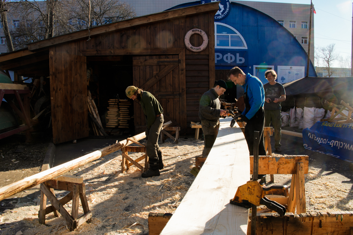 Парни строгают скобелем — «скобелируют» (продолжаем генерировать окказионализмы; есть ещё, кстати, и «скобелье» о человеке, работающем скобелем) его центральные части. Они почти готовы, но поставить их сегодня мы не успеем, как бы сильно ни хотелось этого капитану.