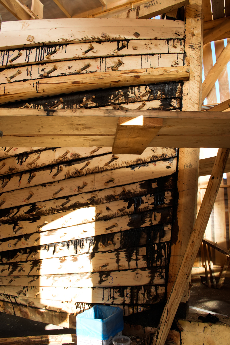 Начали ставить 19-й набой. В это время вокруг коча бродила шайка журналистов, и, конечно, доска встала криво, в понедельник придется переделывать. Артем разволновался и очень просил никого из журналистов на стройку в момент установки досок не пускать. В чём-то я с ним согласен. Я бы и дневник стройки на публике не вел, но приходится. Коч изначально задуман как публичный проект. Значит, приходится публиковать мысли и пускать пишущих женщин на место стройки.