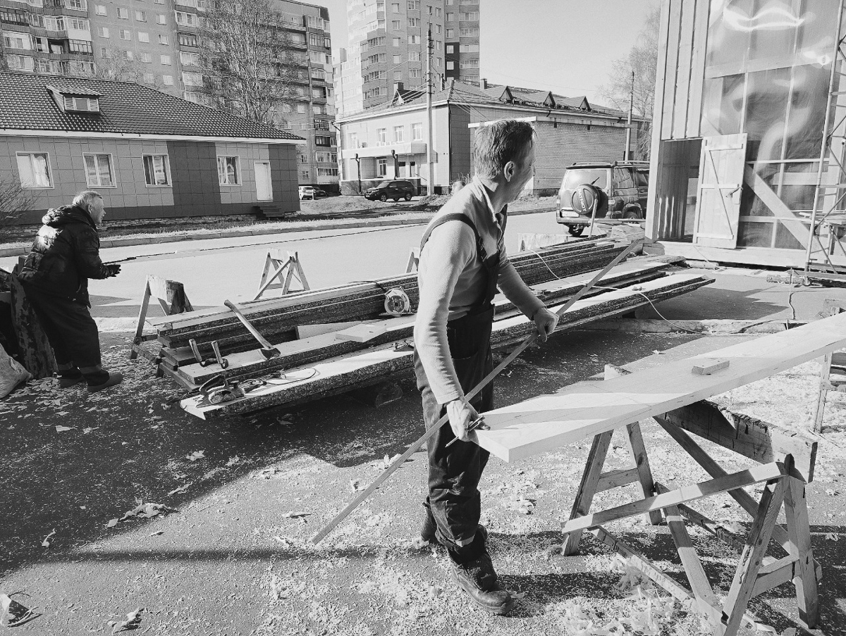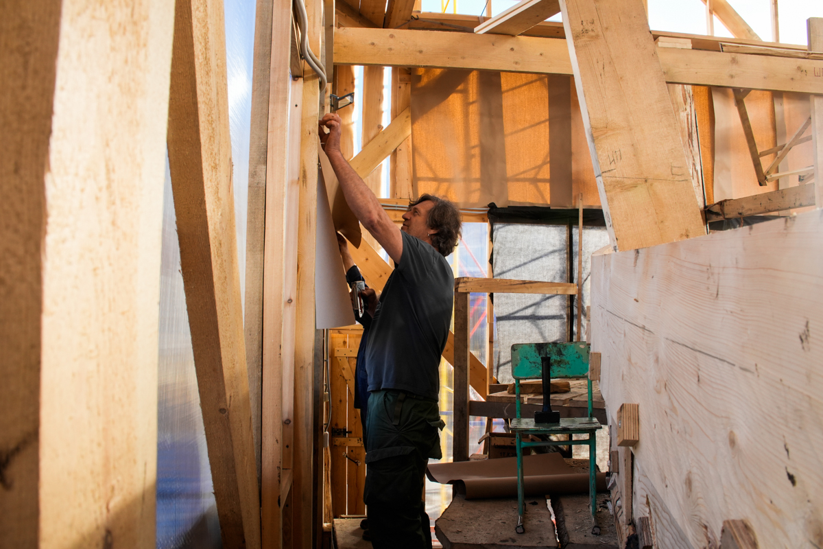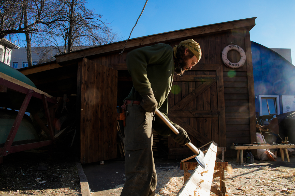 Погода стоит тёплая, солнечная и сухая. Женя просит дождя и прохлады, чтобы доски не так быстро сохли и, соответственно, не трескались, и заклеивает окна ангара бумагой.