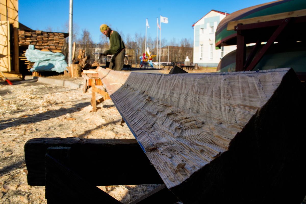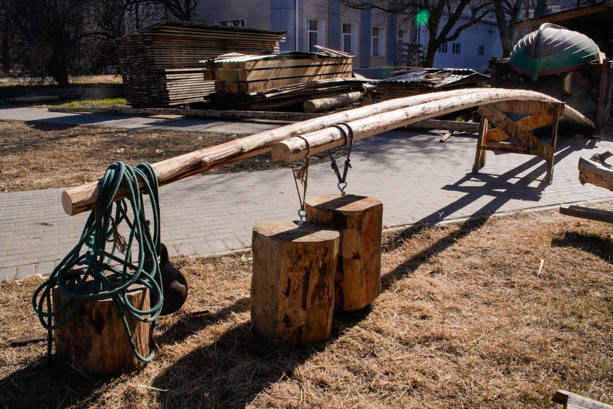Поэтому последние несколько дней Вадим оставил делать шпангоуты и готовит из длинных бревен заготовки привальника. Сегодня я попробовал придать заготовкам нужную изогнутую форму: нашли куда подсунуть комлевую часть бруса, подставили под середину заготовки козлы и подвесили за узкий конец грузы. Заготовка изогнулась под форму борта. Интересно, что в течении дня заготовка продолжала гнуться до тех пор, пока грузы не вставали на землю. Под вечер нам пришлось увеличить высоту барьера, посмотрим, что будет с этими грузами к утру.