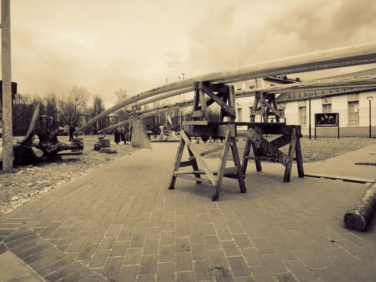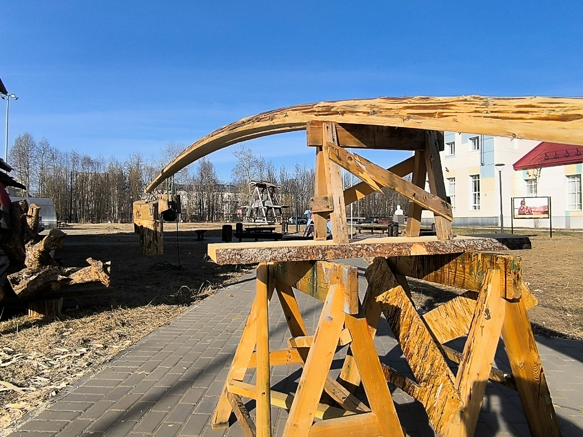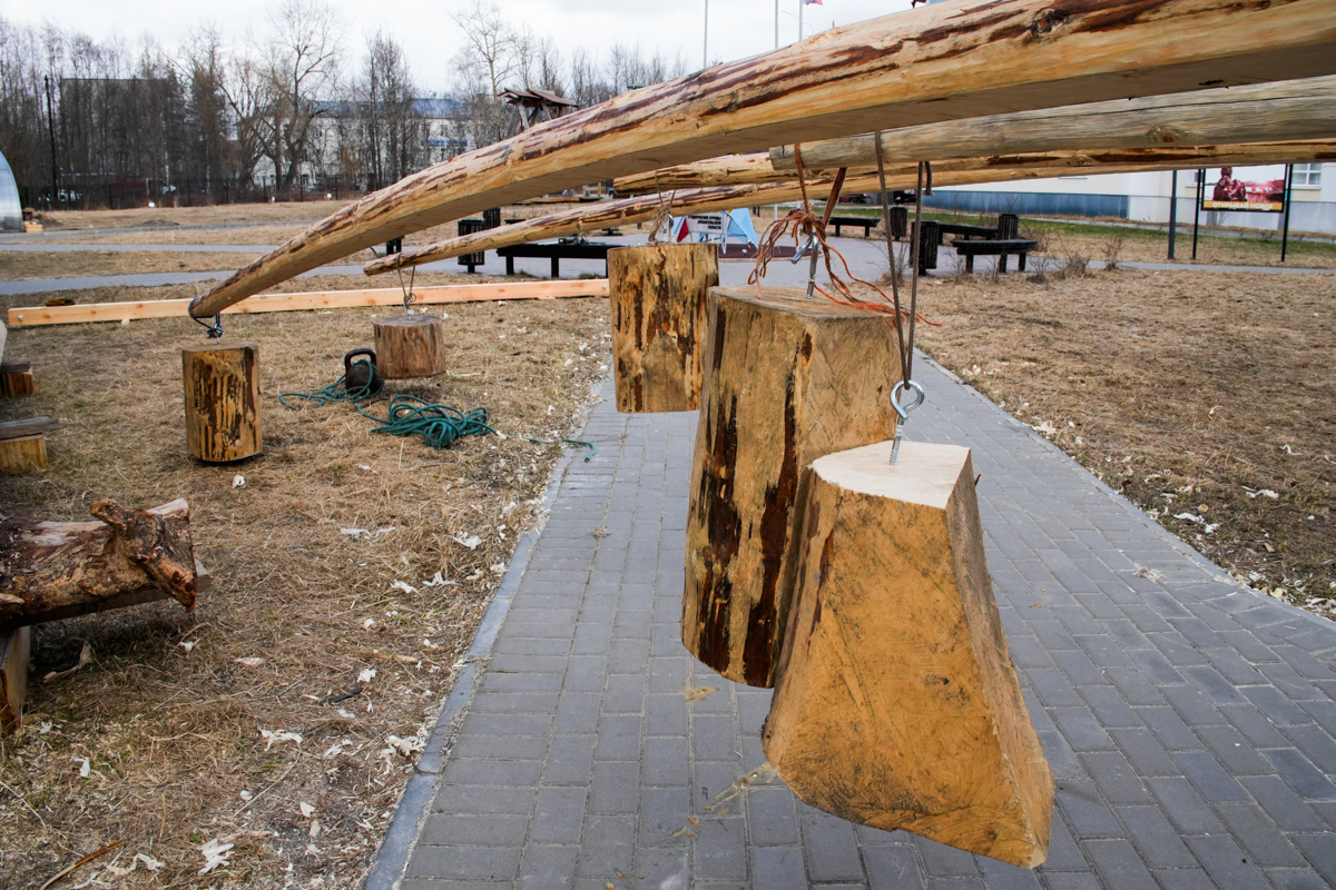 В ожидании привального бруса соорудили с Вадимом инсталляцию — «он и гири». Приручаем заготовки бруса сгибаться. Ждем, что из этого выйдет.